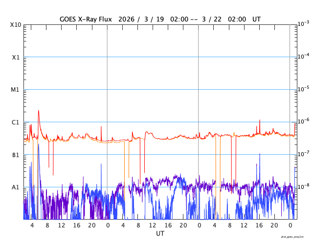 GOES衛星の太陽X線強度。赤・橙 = 0.1〜0.8 nm、青・紫 = 0.05〜0.4 nm (c) データ:NOAA/SWPC、作図:宇宙天気ニュース ![]() | ||||||||||||||||||||||||||||||||||||||||||||||||||||||||||||||||||||||||||||||||||||||||||||||||||||||||||||||||||||||||||||||||||||||||||||||||||||||||||||||||||||||||||||||||||||||||||||||||||||||||||||||||||||||||||