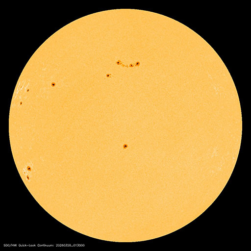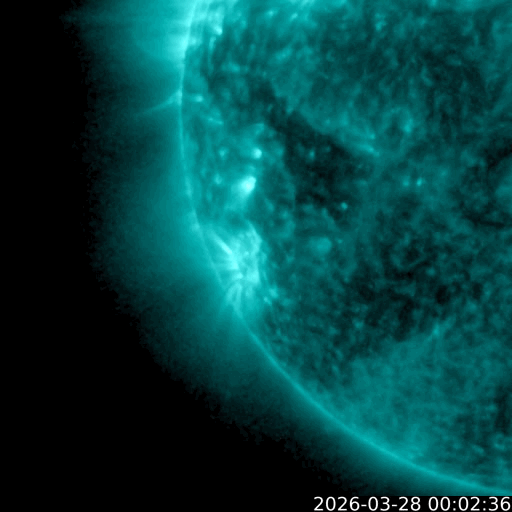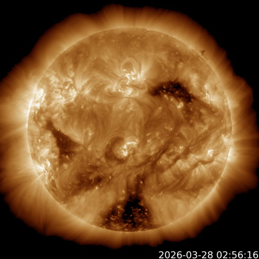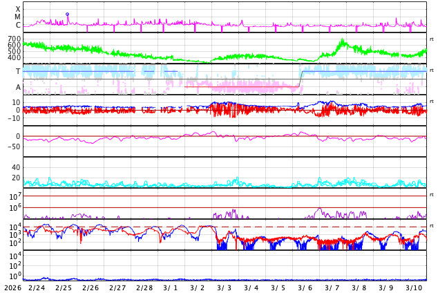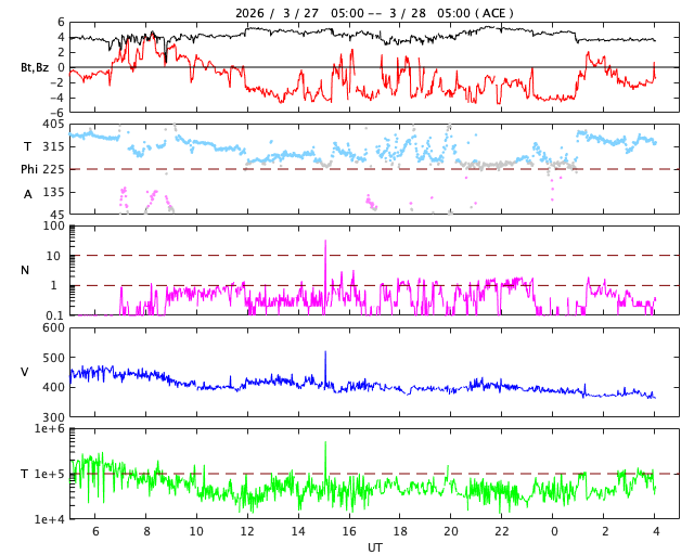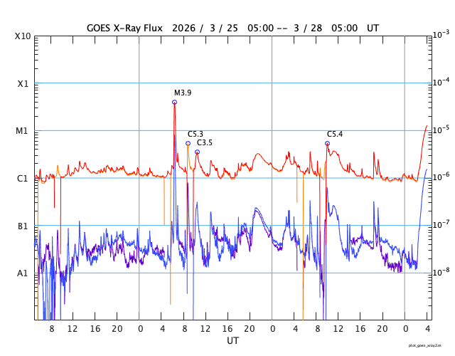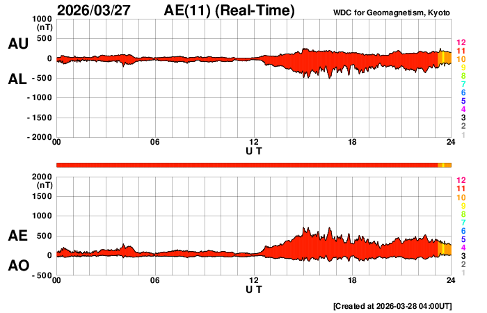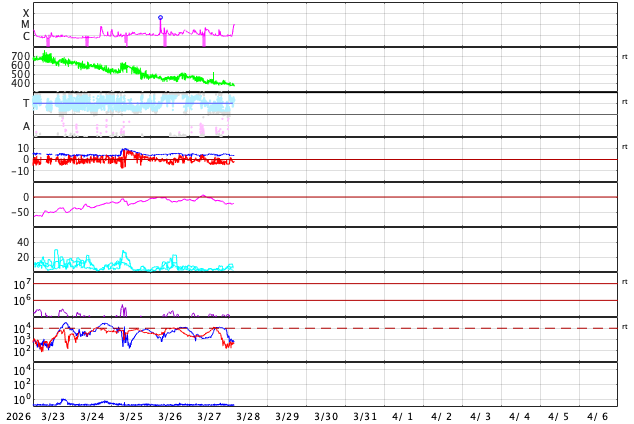 2026/ 3/28 13:15 更新 太陽風はやや低速になっています。M1.3に達する中規模フレアが発生しています。 担当 篠原 太陽風の速度は、450km/秒から380km/秒に下がり、 やや低速になっています。 磁場強度は、4nT前後で推移しています。 磁場の南北成分は、 グラフの中盤から -4nT程度の南寄りの変化が続いています。 磁気圏の活動はやや強まった状態で、 AE指数は、500nT程度の変化が半日ほど続いています。 GOS衛星SUVI 195の太陽コロナ写真では、 北半球のコロナホールは北西(右上)に進んでいます。 この後、太陽風への影響は見られるでしょうか。 南極付近のコロナホールは、 地球に対しては横向きなので影響はないと考えると、 次の影響は、南東側(左下)に見えてきたコロナホールになりそうです。 太陽は、X線グラフの最後で、 Mクラスに達する中規模フレアが発生しています。 現時点では、M1.3に達している様です。 現象の途中ですがGOES衛星SUVI 131の動画を掲載します。 発生場所は、南東の4405黒点群です。 動画の様子から、 CME(コロナ質量放出)も発生しているかもしれません。