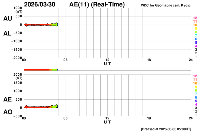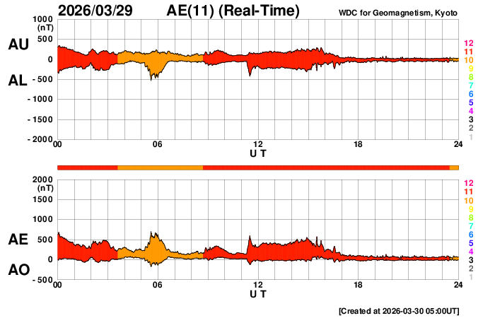 2026/ 3/30 14:01 更新 X1.4の大規模フレアが発生しました。ニュージーランドのオーロラをどうぞ。 担当 篠原 ニュージーランド南島クィーンズタウンの米戸 実さんより、 21日と22日夜に撮影されたオーロラの写真をいただきました。 前日の20日から太陽風が強まり始めていて、 1枚目の写真の頃には、速度は500km/秒近くに高まり、 磁場強度は30nTとかなり大きくなっていました。 磁気圏の活動も強まって、Dst指数は -70nT程度まで変化しました。 下層から上空にかけて光のグラデーションが広がり、 オーロラの縦の厚みを強く感じさせてくれます。 その上空には、南天の天の川が美しく輝いています。 横に傾いて南十字も写っています。 そして、湖面の輝きが本当に見事です。 2枚目は翌日で、太陽風の速度は600km/秒に高まり、 磁場強度は10nTに下がりましたが、南向きの状態が続き、 AE指数が1500nTを超えて激しく変化していた頃です。 何本も縦に伸びる光の筋が印象的です。 オーロラの写真は続きがあります。明日、掲載します。 太陽で、X1.4の大規模フレアが発生しました。 発生時刻は、30日12時(世界時30日3時)。 場所は、南東(左下)の4405黒点群です。 GOES衛星SUVI 131の動画を掲載します。 この規模のフレアの発生は、 2月4日のX4.2以来で、およそ2か月ぶりです。 このフレアに伴って、CME(コロナ質量放出)が発生しています。 SOHO衛星LASCO C2と、 太陽を地球よりも右斜めから観測しているSTEREO Ahead衛星COR2 の動画を掲載します。 フレアの発生から時間があまり経っていないので、 噴出の最初の頃の画像しかなく、 CMEの広がり方ははっきりとはわかりません。 フレアの発生位置から考えると、 太陽風の乱れは地球にやってくるのではないでしょうか。 発生から2日程度かかると考えると、明後日、4月2日の昼頃でしょうか。 注目して下さい。 太陽風は、昨日は350km/秒と低速だったのですが、 昨夜くらいから上昇が始まって、 現在は470km/秒と高速風に近い速さまで高まっています。 磁場強度は、7nTから13nTへ強まり、 現在は8nTに下がっています。 磁場の南北成分は、0nT付近から北寄りになり、 現在は0nT付近に戻っています。 現在の磁気圏は穏やかで、 AE指数は、前半に小規模の変化が起きていますが、 後半は変化が見られなくなっています。 GOES衛星SUVI 195では、 赤道域のコロナホールが、太陽の中心線に達しています。 この領域の影響とCMEの乱れが重なるように到来するかもしれません。 ![]() ニュージーランド南島クィーンズタウンで、現地21日22時43分(世界時21日9時43分)に撮影されたオーロラ。 (c) 米戸 実氏 ![]() ニュージーランド南島クィーンズタウンで、現地22日23時26分(世界時22日10時26分)に撮影されたオーロラ。 (c) 米戸 実氏 ![]() 4405黒点群で発生した、X1.4の大規模フレア。 (c) GOES衛星SUVI 131 (NOAA)、(動画加工 : 宇宙天気ニュース) ![]() 太陽の左下へ広がるCME。 (c) SOHO衛星LASCO C2 (ESA & NASA)、(動画加工 : 宇宙天気ニュース) ![]() 太陽を地球よりも右斜めから観測しているSTEREO Ahead衛星によるCME。 (c) STEREO Ahead衛星COR2 (NASA)、(動画加工 : 宇宙天気ニュース) ![]() GOES衛星のSUVI 195カメラによる太陽コロナの様子 (c) NOAA/SWPC ![]() SDO衛星による太陽の可視光写真(SOHO衛星の画像ページより取得)。 マウスの矢印を写真に重ねると、黒点番号付きの写真に切り替わります。 (c) SDO (NASA) ![]() GOES衛星の太陽X線強度。赤・橙 = 0.1〜0.8 nm、青・紫 = 0.05〜0.4 nm (c) データ:NOAA/SWPC、作図:宇宙天気ニュース ![]() ACEが観測した太陽風の磁場(黒線は全体の強度、赤線は南北成分) 磁場の向き、プラズマの密度、速度、温度 (c) データ:NOAA/SWPC、作図:宇宙天気ニュース ![]() AE指数(速報値) 下段のAEグラフの値が高くなると、オーロラ活動が活発化しています。 (c) 京都大学WDC ![]() ![]() 27日の太陽周期に合わせた図 太陽が同じ面を地球に向けていた27日前の変化から、今後を予想することができます。 (c) 作図:宇宙天気ニュース