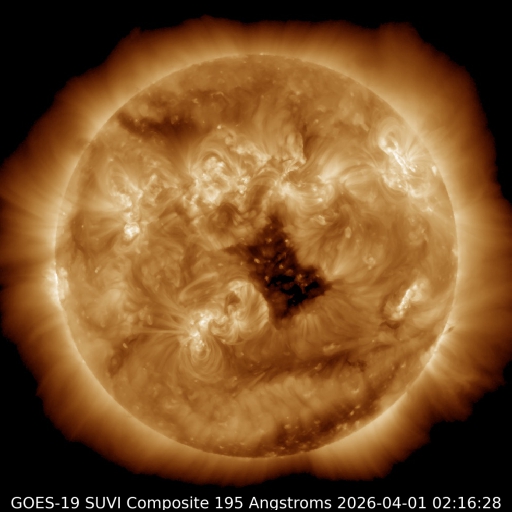 2026/ 4/ 1 12:27 更新 太陽風の速度はやや低速になっています。CMEによる乱れはまだ到来していません。 担当 篠原 太陽風の速度は、430km/秒から380km/秒へ少し下がり、 やや低速になっています。 磁場強度は、5nTと平均的な状態です。 30日に発生したCME(コロナ質量放出)による太陽風の乱れは、 まだ到来していません。 フレアの発生から2日が経過しているので、 乱れの速度は、普通の高速風くらいになるのではないでしょうか。 太陽風磁場の南北成分は、 小幅で北を向いたり南を向いたりしています。 南を向いた頃に磁気圏の活動がある程度強まって、 AE指数では、500nT程度の変化が発生しています。 GOES衛星SUVI 195では、 太陽中心部のコロナホールは西側(右側)に少し進んでいます。 見える位置から考えると、明日くらいから影響が始まりそうですが、 その前にCMEの乱れが始まりそうです。 引き続き注目して下さい。 太陽は、C1の小さい小規模フレアが数回発生した程度で、 穏やかな状態です。 一方、可視光写真では黒点群が10群も見えていて、 賑やかな状況です。