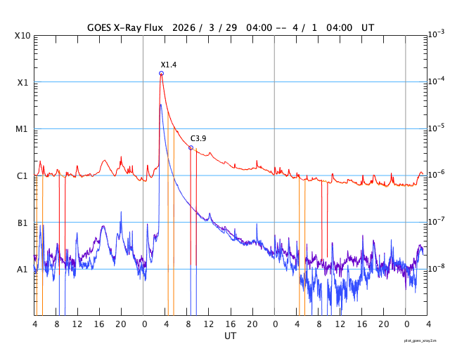 GOES衛星の太陽X線強度。赤・橙 = 0.1〜0.8 nm、青・紫 = 0.05〜0.4 nm (c) データ:NOAA/SWPC、作図:宇宙天気ニュース ![]() | ||||||||||||||||||||||||||||||||||||||||||||||||||||||||||||||||||||||||||||||||||||||||||||||||||||||||||||||||||||||||||||||||||||||||||||||||||||||||||||||||||||||||||||||||||||||||||||||||||||||||||||||||||||||||||||||||||||||||||||||||||||||||