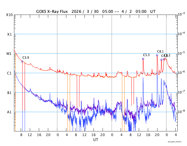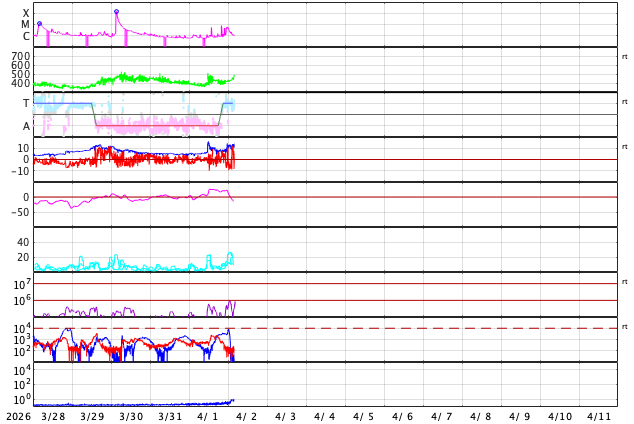 GOES衛星の太陽X線強度。赤・橙 = 0.1〜0.8 nm、青・紫 = 0.05〜0.4 nm (c) データ:NOAA/SWPC、作図:宇宙天気ニュース ![]() | ||||||||||||||||||||||||||||||||||||||||||||||||||||||||||||||||||||||||||||||||||||||||||||||||||||||||||||||||||||||||||||||||||||||||||||||||||||||||||||||||||||||||||||||||||||||||||||||||||||||||||||||||||||||||||||||||||||||||||||||||||||