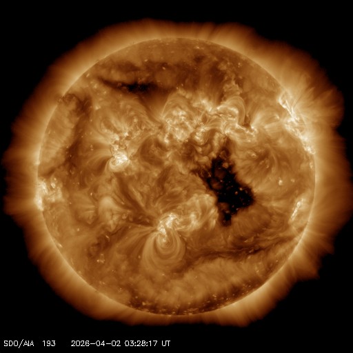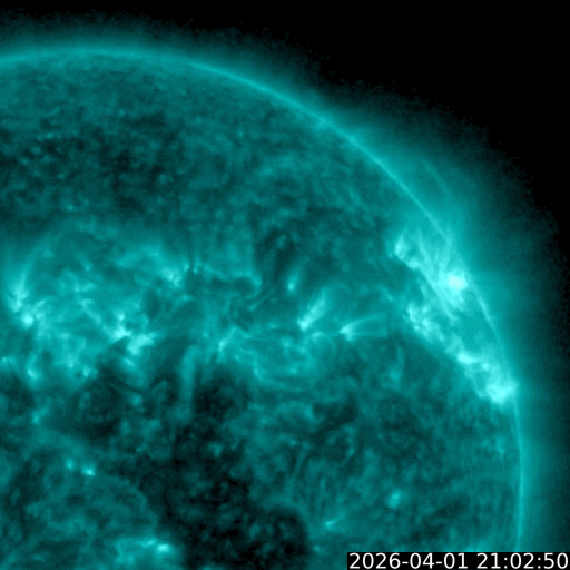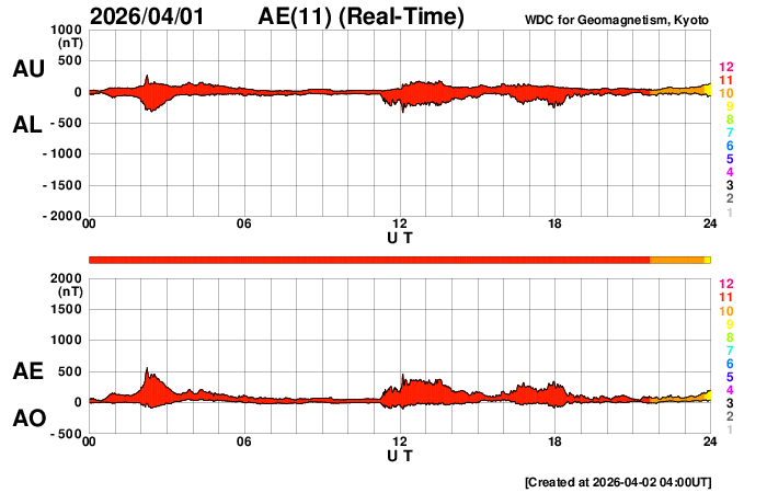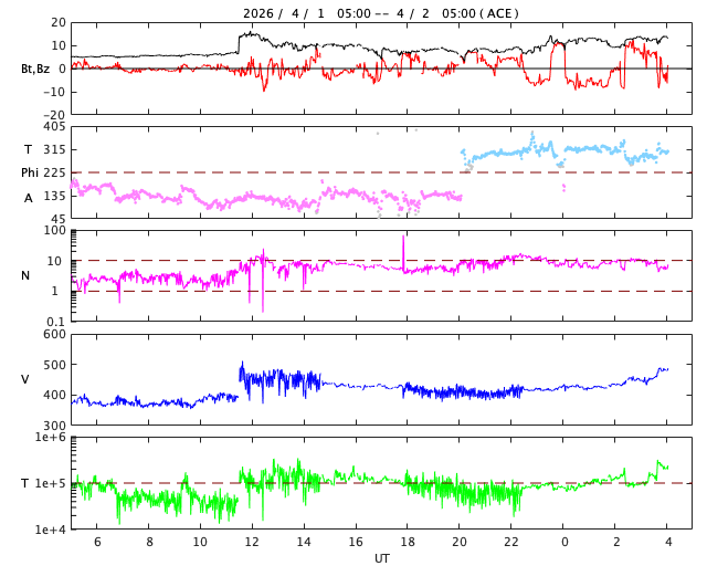 2026/ 4/ 2 13:14 更新 小規模の太陽風の乱れが到来しました。太陽風の速度は450km/秒に上がった程度です。 担当 篠原 30日のCME(コロナ質量放出)による太陽風の乱れは、 昨夜、1日20時半(世界時1日11時半)頃にACE衛星で観測され、 地球へは1日21時(世界時1日12時)頃に到来しています。 変化は小幅で、 太陽風の速度は、400km/秒から450km/秒へ、 磁場強度は、6nTから15nTへ強まった程度です。 磁場の南北成分は0nT付近で変化したので、 磁気圏への影響は小さく、 AE指数は300nTの小規模の変化が発生した程度です。 その後、太陽風の速度は400km/秒に下がり、 グラフの後半で再び450km/秒に高まっています。 速さとしては平均的な状態です。 磁場強度は、10nT前後で推移しています。 グラフの後半で磁場の南北成分が大きく変化する様になり、 AE指数も、グラフの最後に700nTと中規模の変化が発生しています。 GOES衛星SUVI 195では、 赤道域のコロナホールは西側(右側)に進んでいます。 この領域の影響で、太陽風の速度はもう一段高まるかもしれません。 太陽では、中心部東側(左側)の4409黒点群の活動が少し強まって、 C5.3、C8.1、C4.7と小規模フレアが続いています。 この変化に続く様に、今朝、2日8時(世界時1日23時)に、 北西(右上)の4403群でC6.1の小規模フレアが発生しました。 GOES衛星SUVI 131の動画を掲載します。 GOES衛星SUVI 304の動画を見ると、 フレアとともにフィラメント噴出が発生しています。 これによりCMEが太陽の右上寄りに飛び出しています。 GOES衛星CCOR-1の動画を掲載します。 この動画では、CMEのガスは太陽の左下にも淡く広がっています。 このため、太陽風の乱れは地球の方向にも噴出している様です。 3日後くらいに、 磁場の強まりなどの太陽風の乱れがやって来るかもしれません。