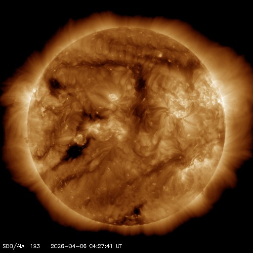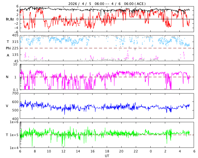 2026/ 4/ 6 14:31 更新 太陽風は高速の状態が続いています。太陽は穏やかになっています。 担当 篠原 MAPS彗星の太陽接近後に、 太陽の右上に広がって行った彗星の尾と思われる部分は、 更に右上に飛んで行っています。 SOHO衛星LASCO C2とC3の動画を掲載します。 C3では、写真を1時間毎に間引いて、 彗星の見え始めからの動画にしています。 彗星が残らなかったのは残念でした。 太陽風は、530km/秒と高速の状態が続いています。 磁場強度は、4nTと平均的な状態です。 SDO衛星AIA193の太陽コロナ写真では、 西の端(右端)に達したコロナホールはほとんど見えなくなっていますが、 この領域の影響が続いているのでしょうか。 太陽風磁場の南北成分は、 南寄りから北寄りに傾向が変わっています。 AE指数もこの影響で、 グラフの途中までは500nT程度の変化が続いていますが、 その後は変化が少なくなって穏やかになっています。 太陽の南東側(左下)や北東側(左上)に小さいコロナホールが見えています。 27日前の前周期は、全体が大きく繋がる広がりになっていて、 太陽風の速度も700km/秒まで高まっていたのですが、 今回はどうなるでしょうか。 太陽は、X線グラフの変化が急に少なくなり、 穏やかになっています。 北西側(右上)の4409黒点群の活動は、 C2.8の小規模フレアが最大です。