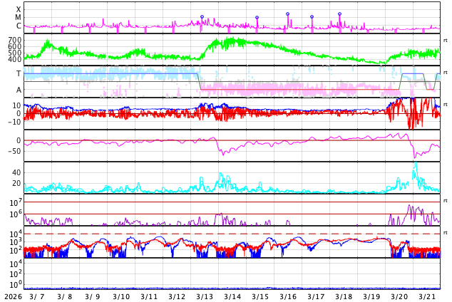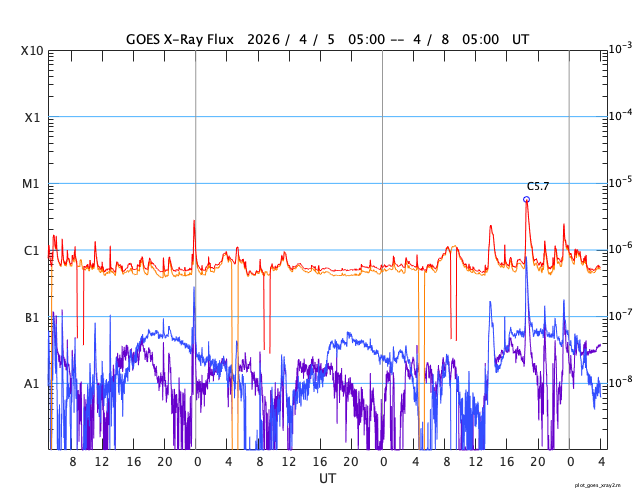 GOES衛星の太陽X線強度。赤・橙 = 0.1〜0.8 nm、青・紫 = 0.05〜0.4 nm (c) データ:NOAA/SWPC、作図:宇宙天気ニュース ![]() | ||||||||||||||||||||||||||||||||||||||||||||||||||||||||||||||||||||||||||||||||||||||||||||||||||||||||||||||||||||||||||||||||||||||||||||||||||||||||||||||||||||||||||||||||||||||||||||||||||||||||||||||||||||||||||||||||||||||||||||||||