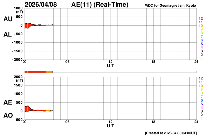 2026/ 4/ 8 13:13 更新 太陽風の速度は平均的な速さに下がっています。磁気圏は穏やかです。 担当 篠原 太陽風の速度は、500km/秒から390km/秒へ下がり、 平均的な速度に戻って、このまま低速になりそうな様子です。 磁場強度は、5nTと平均的な値です。 磁場の南北成分は、グラフの中盤で南向きに強まっています。 この頃に、磁気圏の活動もある程度強まって、 AE指数は、500nTを少し超えるくらいの中規模の変化が 半日ほど続いています。 その後は、磁場は0nT付近で変化する様になり、 現在の磁気圏は穏やかです。 SDO衛星AIA193では、太陽の中心部にコロナホールが見えています。 広がりは前周期よりも小さくなっていますが、 どの程度の影響がやって来るでしょうか。 27日周期の図を見ると、 前周期は、明日に相当する3月13日から太陽風の速度が高まっています。 太陽は、西の端(右端)に近づいた4409黒点群でC5.7の小規模フレア、 北東の端(左上)に現れた4414群でC2.4の小規模フレアが発生しています。 4414群はどの程度の活動度でしょうか。