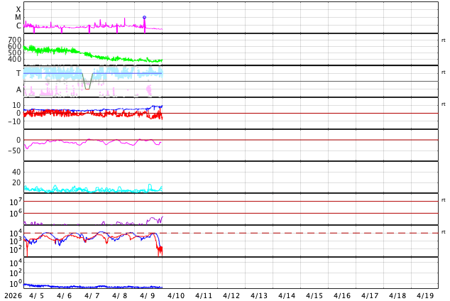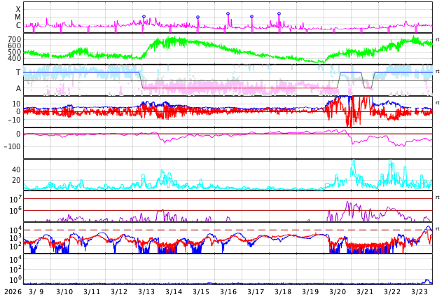 GOES衛星の太陽X線強度。赤・橙 = 0.1〜0.8 nm、青・紫 = 0.05〜0.4 nm (c) データ:NOAA/SWPC、作図:宇宙天気ニュース ![]() | ||||||||||||||||||||||||||||||||||||||||||||||||||||||||||||||||||||||||||||||||||||||||||||||||||||||||||||||||||||||||||||||||||||||||||||||||||||||||||||||||||||||||||||||||||||||||||||||||||||||||||||||||||||||||||||||||||||||||||||||