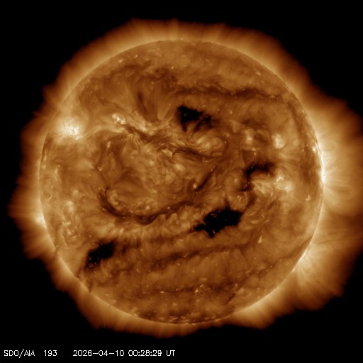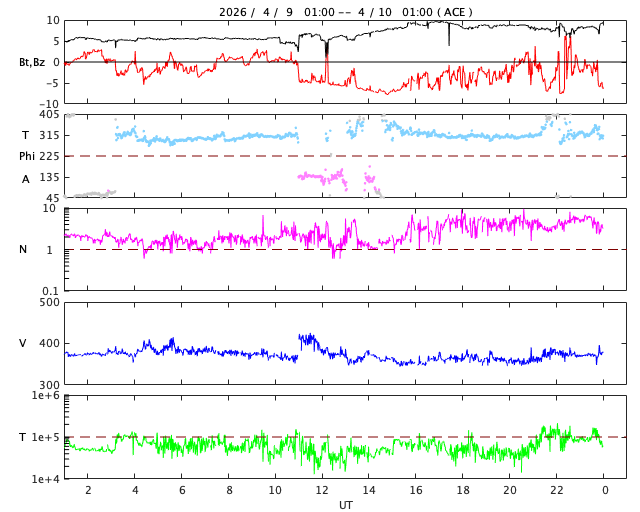 2026/ 4/10 09:48 更新 太陽風は低速ですが、磁場が南向きに変化して磁気圏の活動が強まりました。 担当 篠原 太陽風は、360〜380km/秒と低速の状態で推移していますが、 グラフの中程で小幅ですが 速度が400km/秒に急に高まる変化が発生しています。 太陽風の弱い乱れが到来した様で、 磁場強度を見ると、初めは5nTと平均的な状態でしたが、 速度が高まった頃から上昇が始まり、 グラフの後半は9nTとやや強まった状態に変わっています。 南北成分も、グラフの前半は0nT付近でしたが、 速度が高まった所から急に南向きに変化して、 -5nT程度の南向きがしばらく続いています。 この影響で磁気圏の活動が強まり、 AE指数は、前半は変化がありませんでしたが、 途中から500〜1000nTと中規模の活動が半日近く発生しています。 現在は磁場の南北成分は0nT付近に戻っていて、 磁気圏の活動も小さくなっています。 SDO衛星AIA193の太陽コロナ写真では、 小ぶりのコロナホールが 中心部の南西側(右下)や北側(上側)に見えています。 この領域の影響がこれから始まりそうです。 27日周期の図を見ると、 前周期の速度の高まりは3月13日に始まっていますが、 今回はこれよりも遅れています。 どの様な変化がやって来るのか注目して下さい。 太陽は、昨夕、9日17時半(世界時9日8時半)に、 西の端(右端)の4409黒点群でM1.0の中規模フレアが発生しました。 この領域が見えなくなると、X線強度は次第に下がり、 変化も見られなくなって、太陽はとても穏やかになっています。 可視光写真では、はっきり見える黒点は、 東側(左側)の4414群と4415群だけになっています。 ![]() SDO衛星のAIA193カメラによる太陽コロナの様子 (c) SDO (NASA) ![]() SDO衛星による太陽の可視光写真。マウスの矢印を写真に重ねると、黒点番号付きの写真に切り替わります。 (c) SDO (NASA) ![]() ACEが観測した太陽風の磁場(黒線は全体の強度、赤線は南北成分) 磁場の向き、プラズマの密度、速度、温度 (c) データ:NOAA/SWPC、作図:宇宙天気ニュース ![]() AE指数(速報値) 下段のAEグラフの値が高くなると、オーロラ活動が活発化しています。 (c) 京都大学WDC ![]() ![]() 27日の太陽周期に合わせた図 太陽が同じ面を地球に向けていた27日前の変化から、今後を予想することができます。 (c) 作図:宇宙天気ニュース