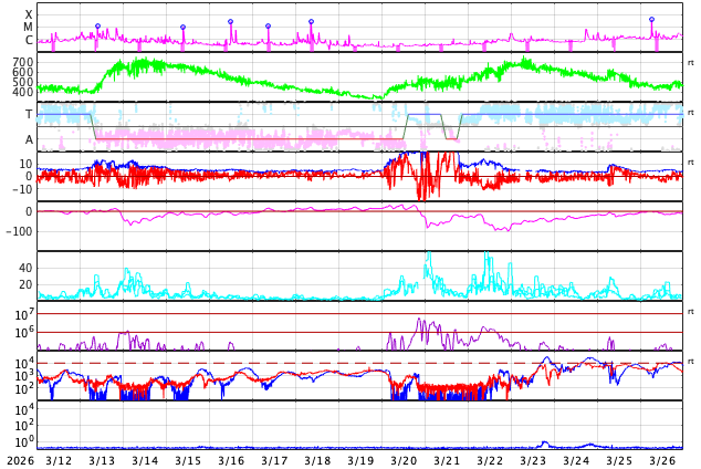 GOES衛星の太陽X線強度。赤・橙 = 0.1〜0.8 nm、青・紫 = 0.05〜0.4 nm (c) データ:NOAA/SWPC、作図:宇宙天気ニュース ![]() | |||||||||||||||||||||||||||||||||||||||||||||||||||||||||||||||||||||||||||||||||||||||||||||||||||||||||||||||||||||||||||||||||||||||||||||||||||||||||||||||||||||||||||||||||||||||||||||||||||||||||||||||||||||||||||||||||||||