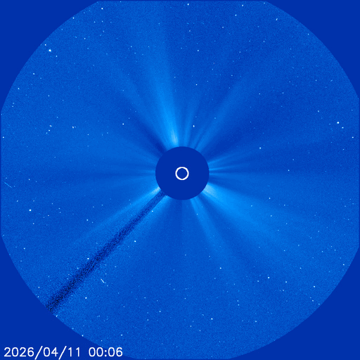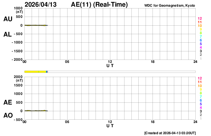 2026/ 4/13 12:33 更新 太陽風は平均的な速度に戻っています。太陽は穏やかな状態です。 担当 篠原 11日から12日にかけて、 小型の彗星が太陽に接近する様子が SOHO衛星LASCO C2、C3で見えていました。 9日のニュースで紹介した彗星の動画とそっくりの見え方です。 太陽風の速度は、550km/秒から450km/秒へゆっくりと低下して、 高速の状態は終わっています。 磁場強度は、5nTと平均的な値が続いています。 コロナホールの影響は、一旦終わった様です。 SDO衛星AIA193を見ると、 太陽の中心部の南側(下側)に小さいコロナホールが見えています。 明後日くらいに、この領域の影響で速度がやや高まるかもしれません。 一方、北東の端(左上)には、コロナホールの大きい広がりが見えています。 5日後くらいから、この領域の影響で太陽風は高速になりそうです。 27日周期の図では、 前周期の3月22日からの速度の高まりの回帰に相当します。 太陽風磁場の南北成分は、弱い南向きの変化が時々発生しています。 磁気圏では小規模の活動が発生していて、 AE指数は、300nT程度の変化が度々発生しています。 速度が下がって来たので、 この後の活動は規模が小さくなりそうです。 太陽は、昨日のニュースの後も西の端(右端)の領域で C1〜2の小規模フレアが発生しましたが、 その後は活動がなくなり、穏やかになっています。
