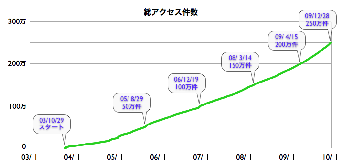 今年も、今日を含めて2日となりました。 2009年も宇宙天気ニュースをご愛読いただき、ありがとうございました。 2009年に入っても太陽活動はずっと穏やかでしたが、 12月に入って黒点の出現頻度が一気に高まり、 第24活動周期もいよいよ本格的に始動したのかもしれません。 今後の展開に期待しつつ、2010年をお迎えください。 年末の大掃除でもありませんが、 宇宙天気ニュースのアクセス件数を整理していたところ、 一昨日、2009年12月28日にアクセスの累計が250万件に達していたことが分かりました。 8カ月前の2009年 4月15日に200万件に達したばかりで、 これまでのペースなら、来年の春ごろと予想していたのでたいへん驚きました。 |