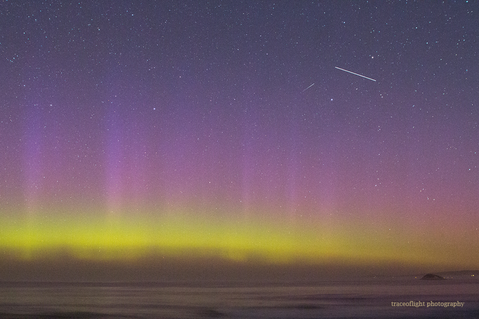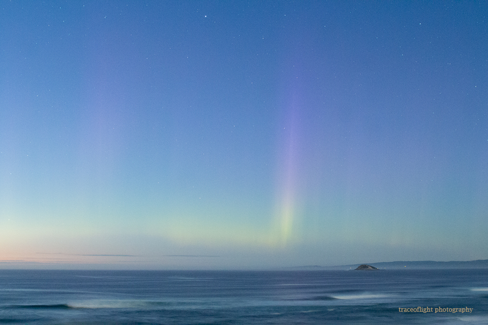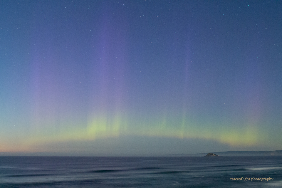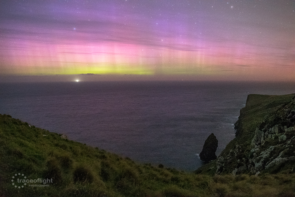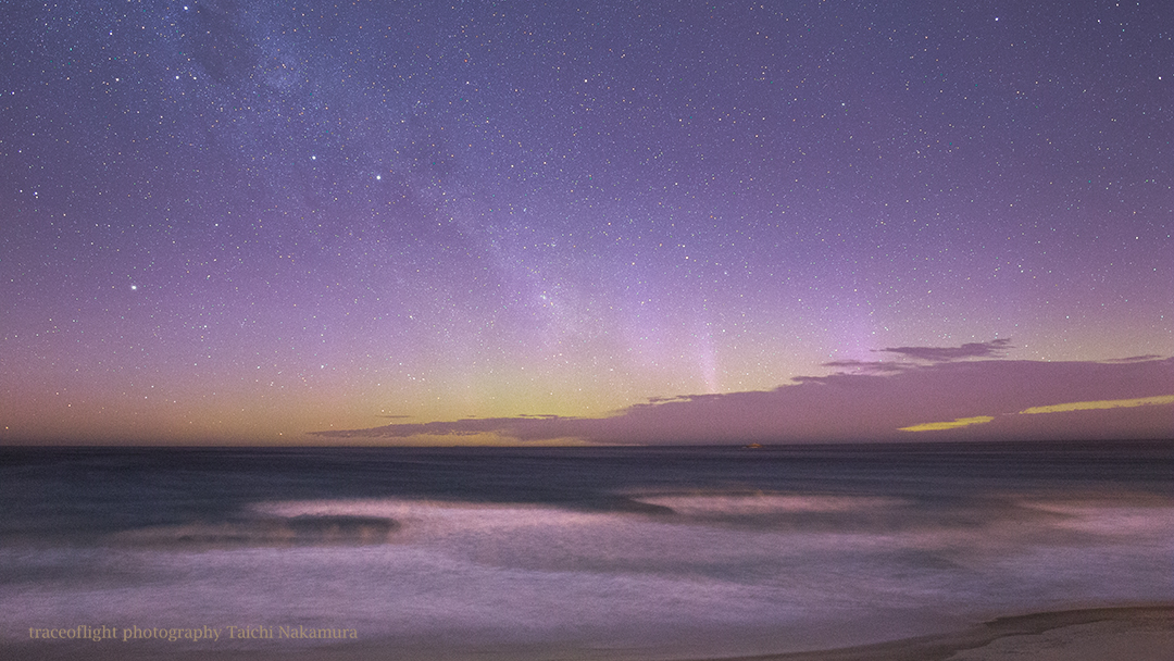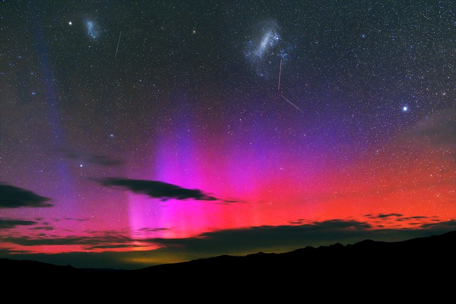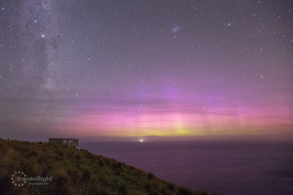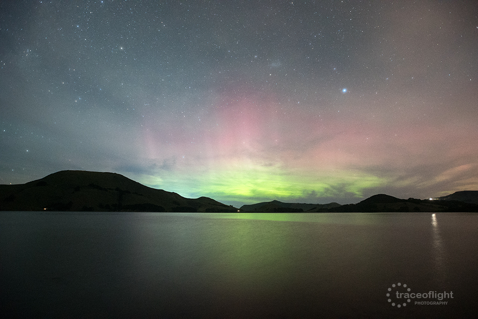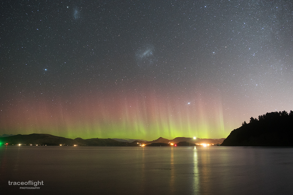ニュージーランド南島ダニーデンで、現地9日の夕暮れ(世界時9日午前)と、現地10日00:10(世界時9日11:10)頃に撮影されたオーロラ。