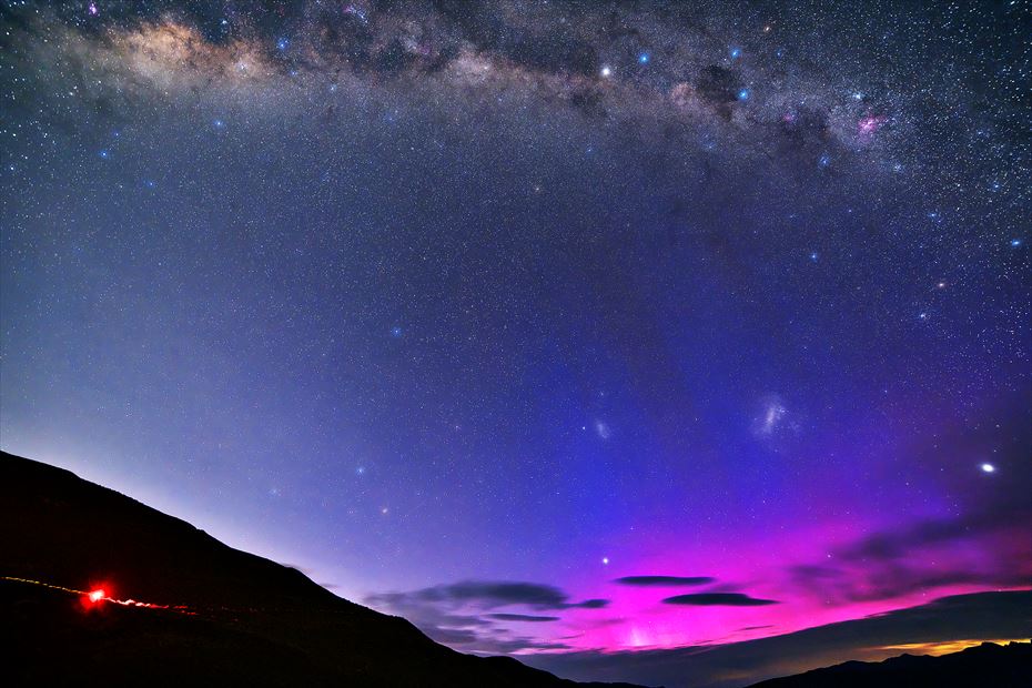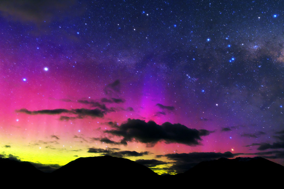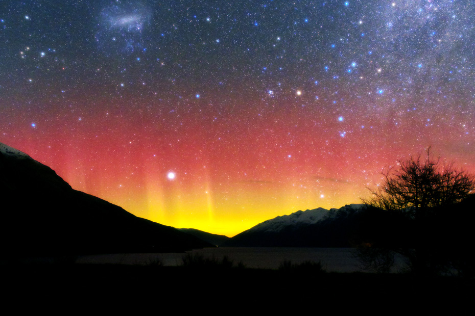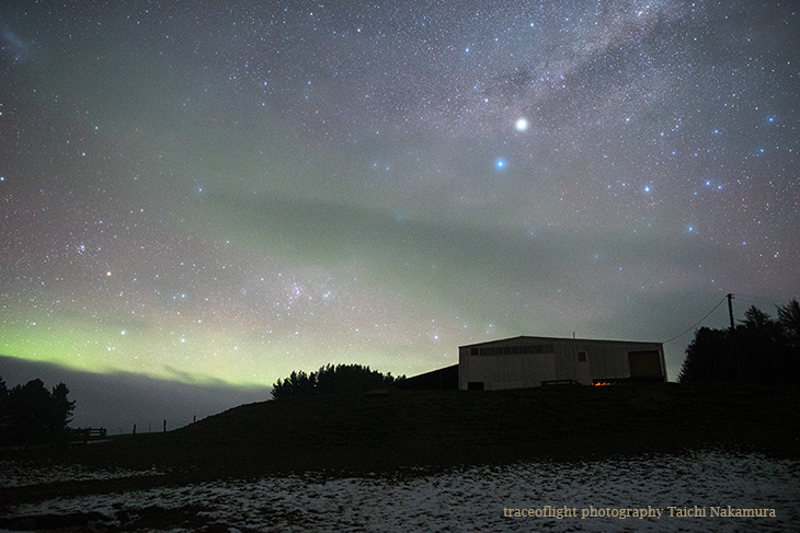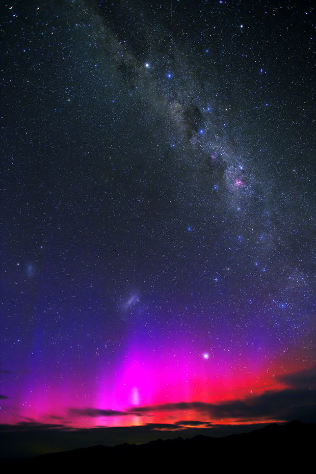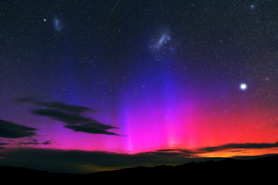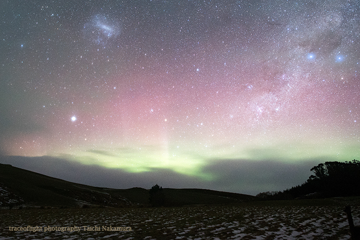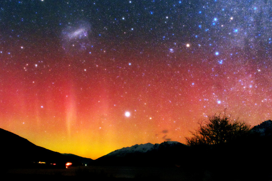 ニュージーランド南島で、現地1日に撮影されたオーロラ。月と木星の接近。