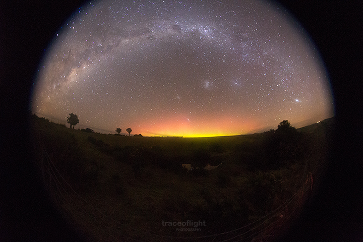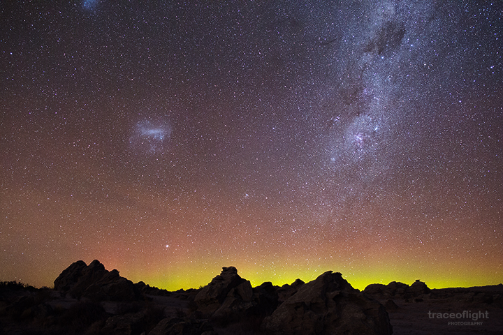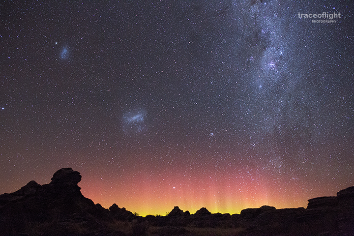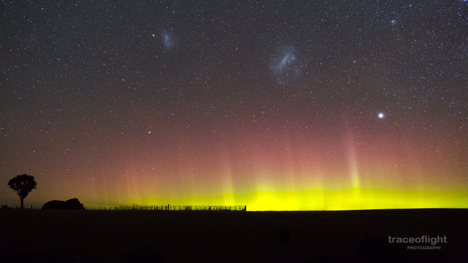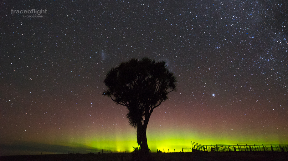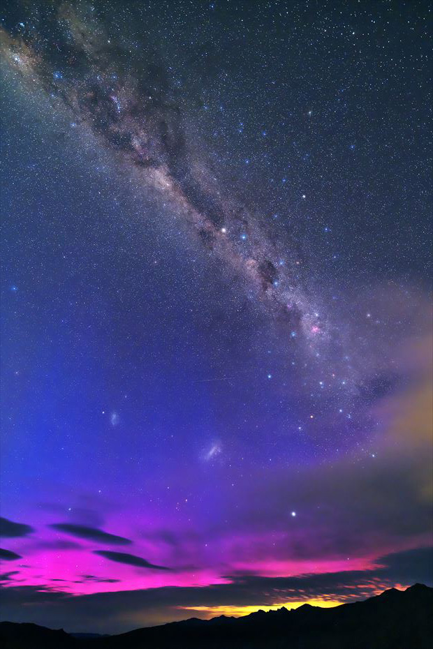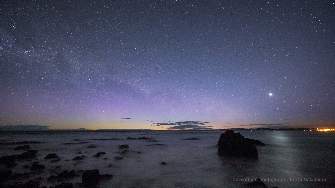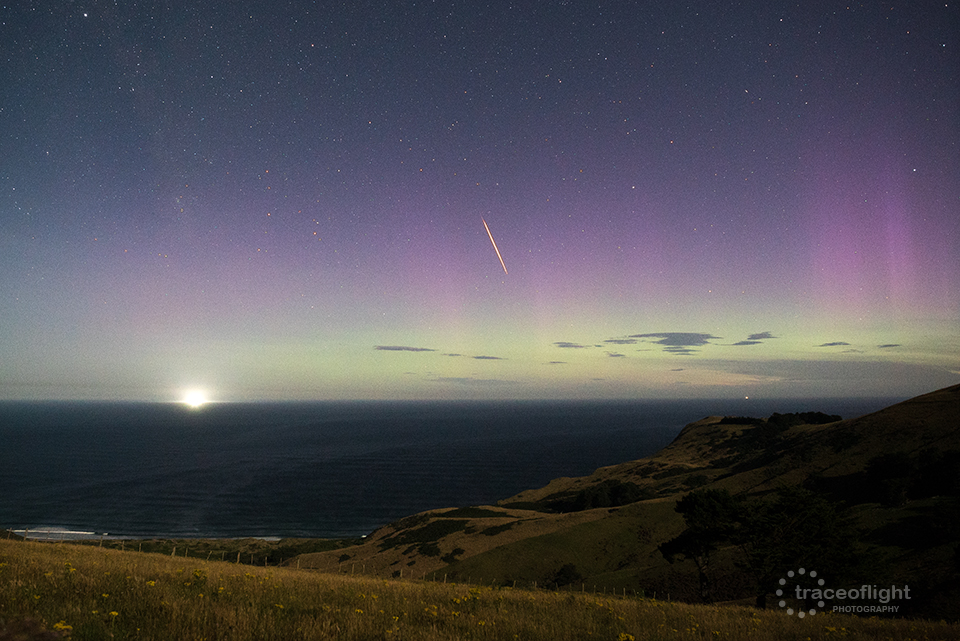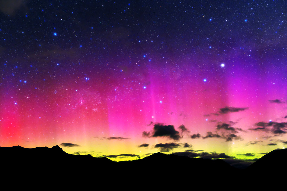 ニュージーランド南島で、現地1日に撮影されたオーロラ。月と木星の接近。