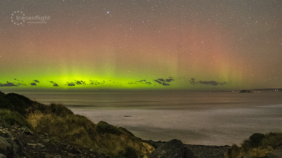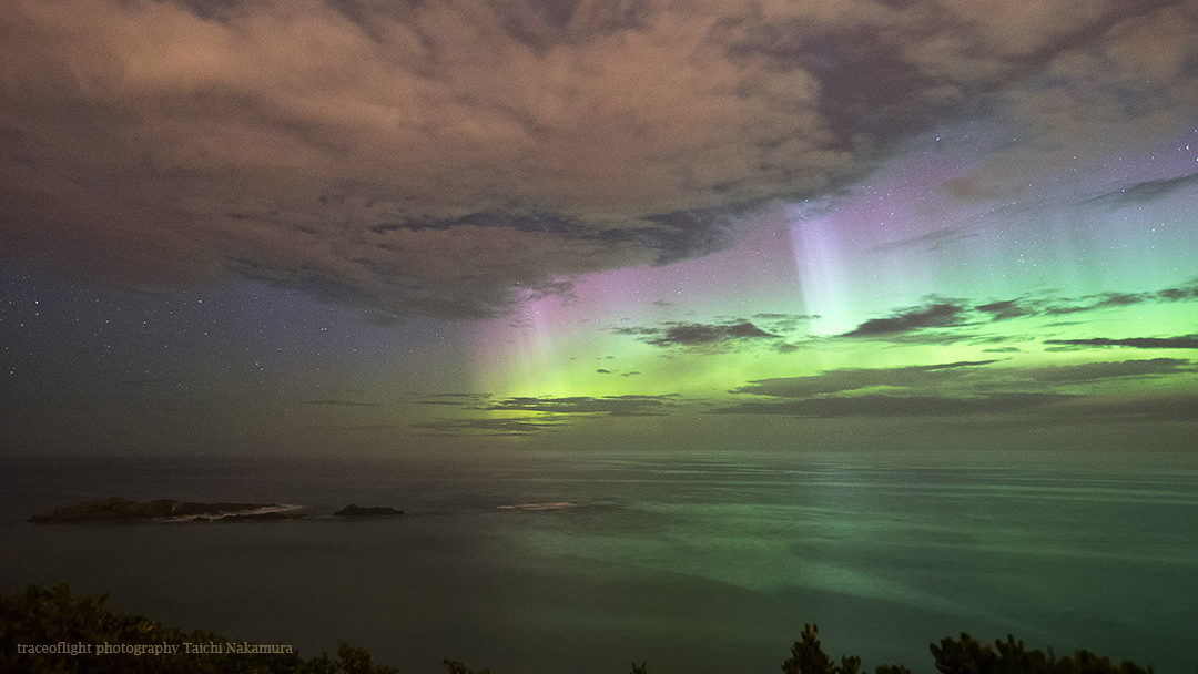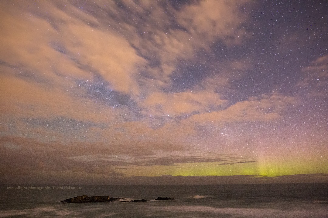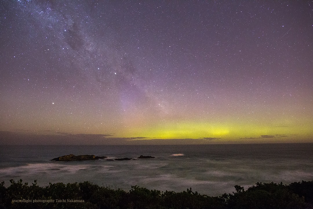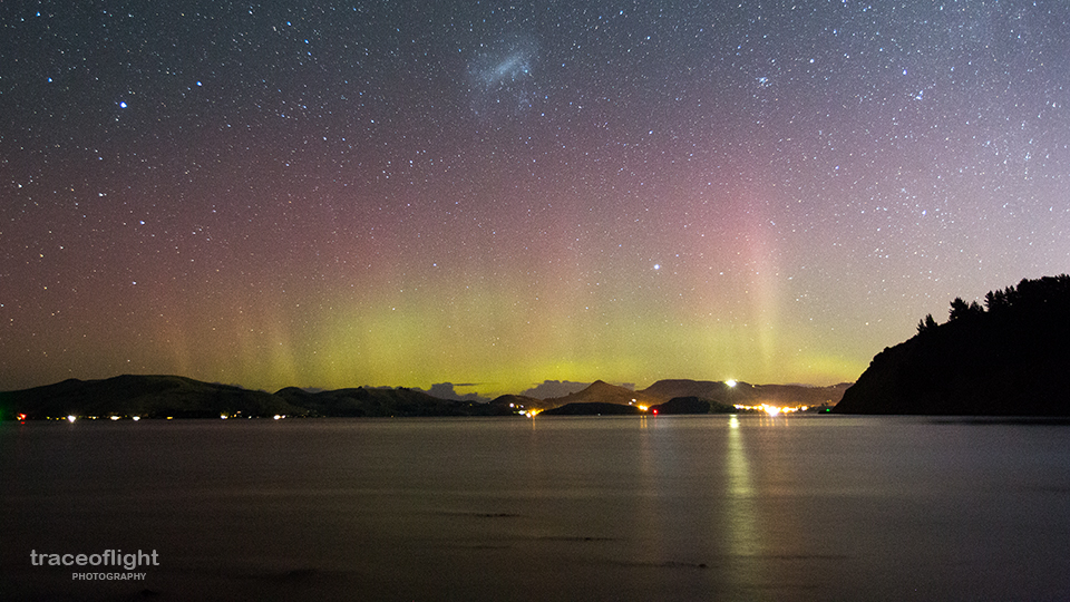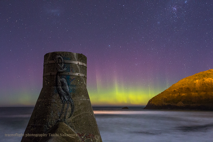 ニュージーランド南島ダニーデンで、現地16日22:24、17日01:07 に撮影されたオーロラ。