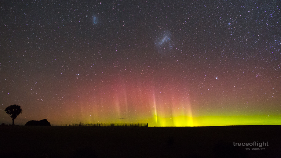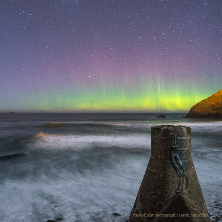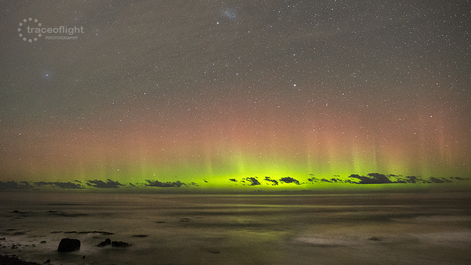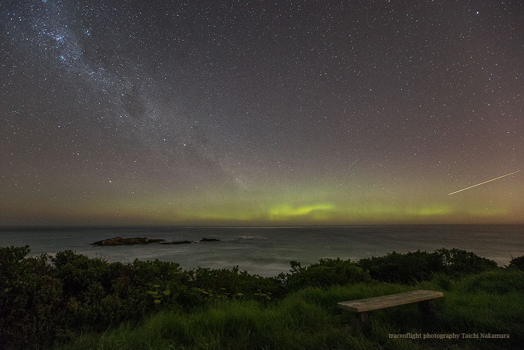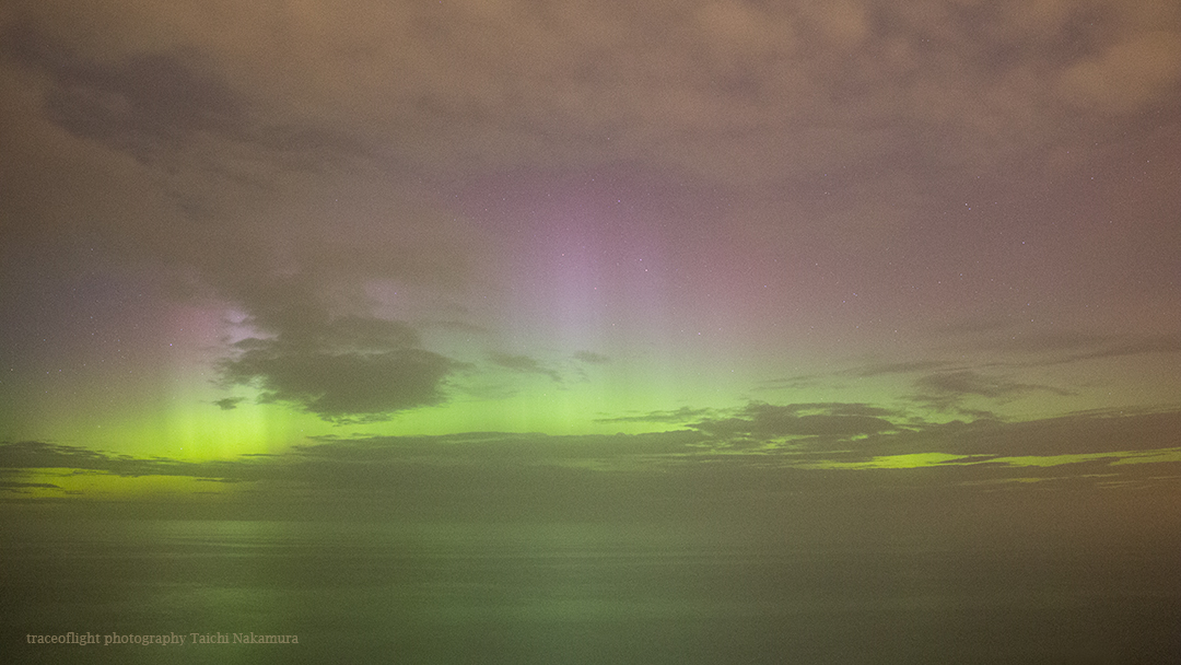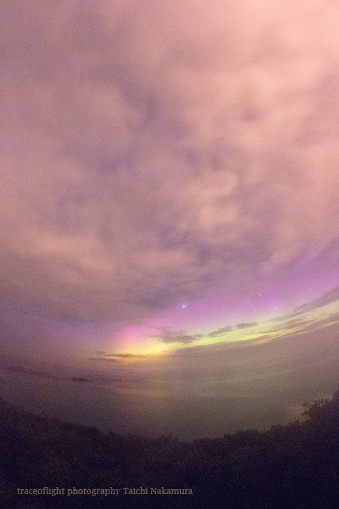 ニュージーランド南島ダニーデンで、現地16日22:24、17日01:07 に撮影されたオーロラ。