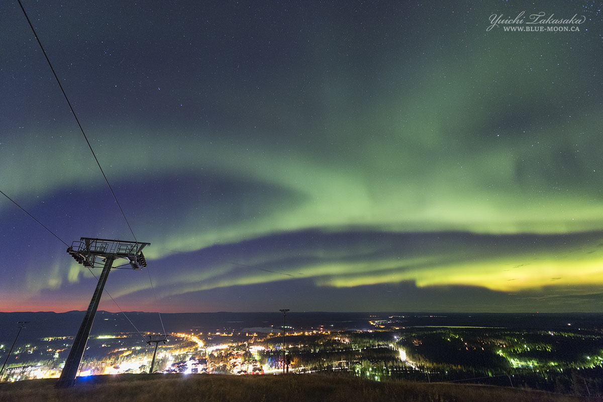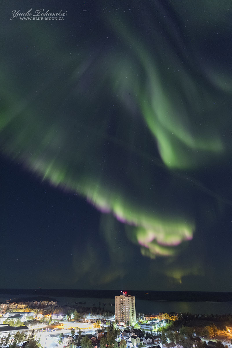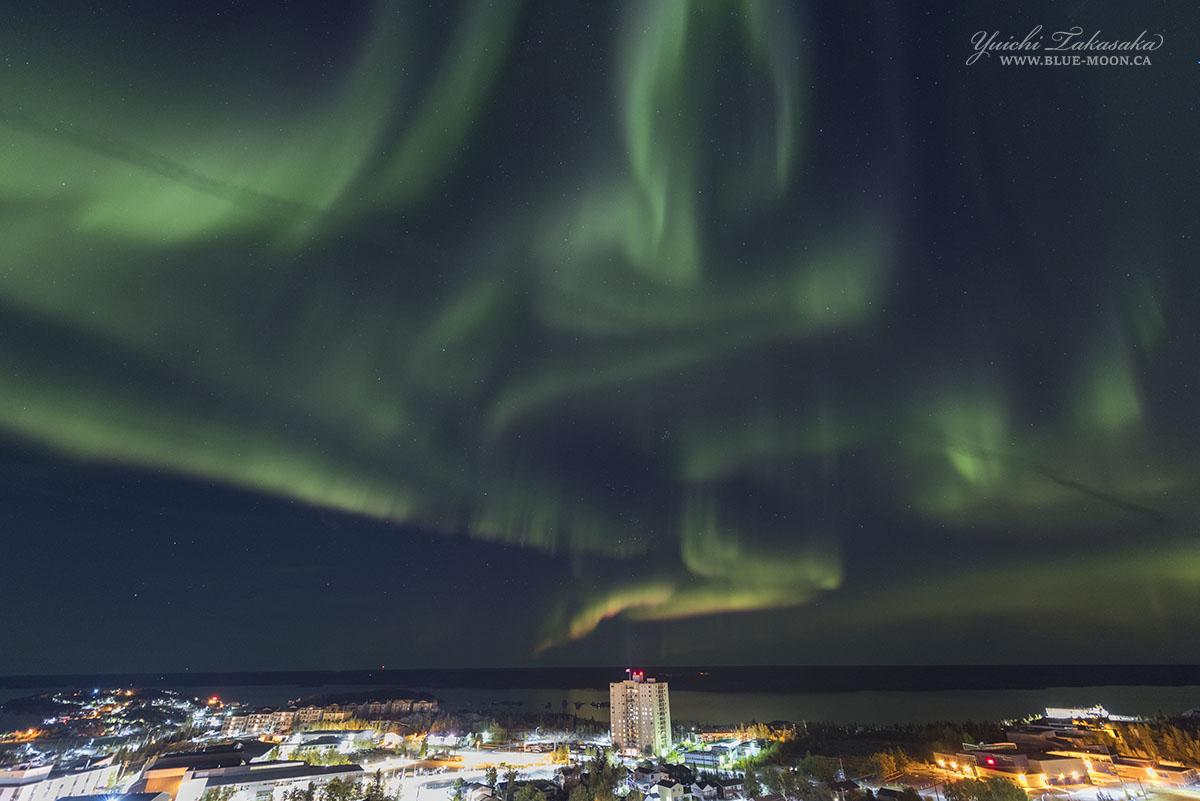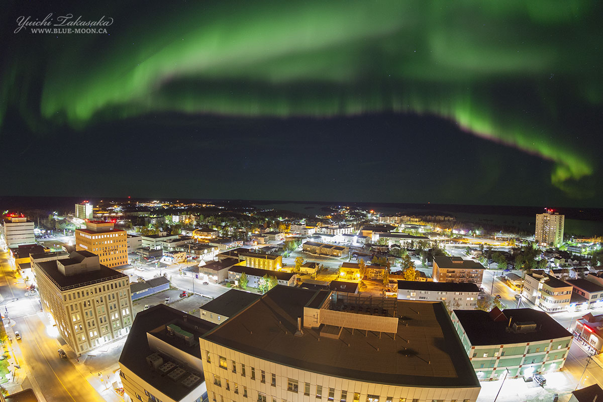カナダのイエローナイフの中心部から見た、現地5日深夜のオーロラの様子。