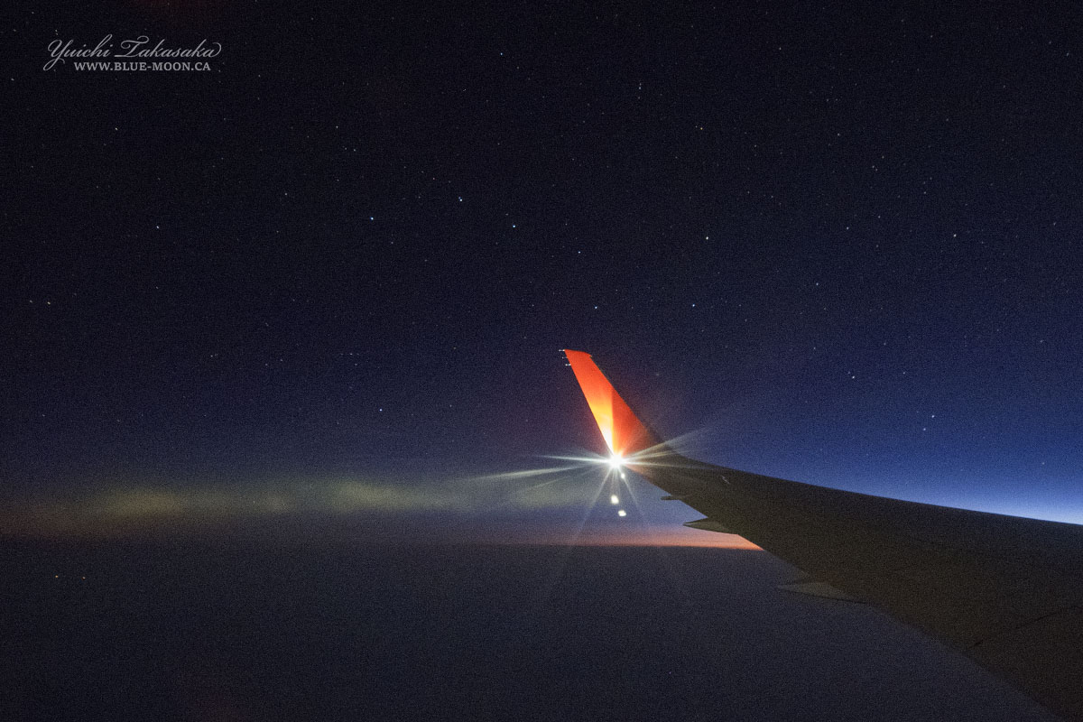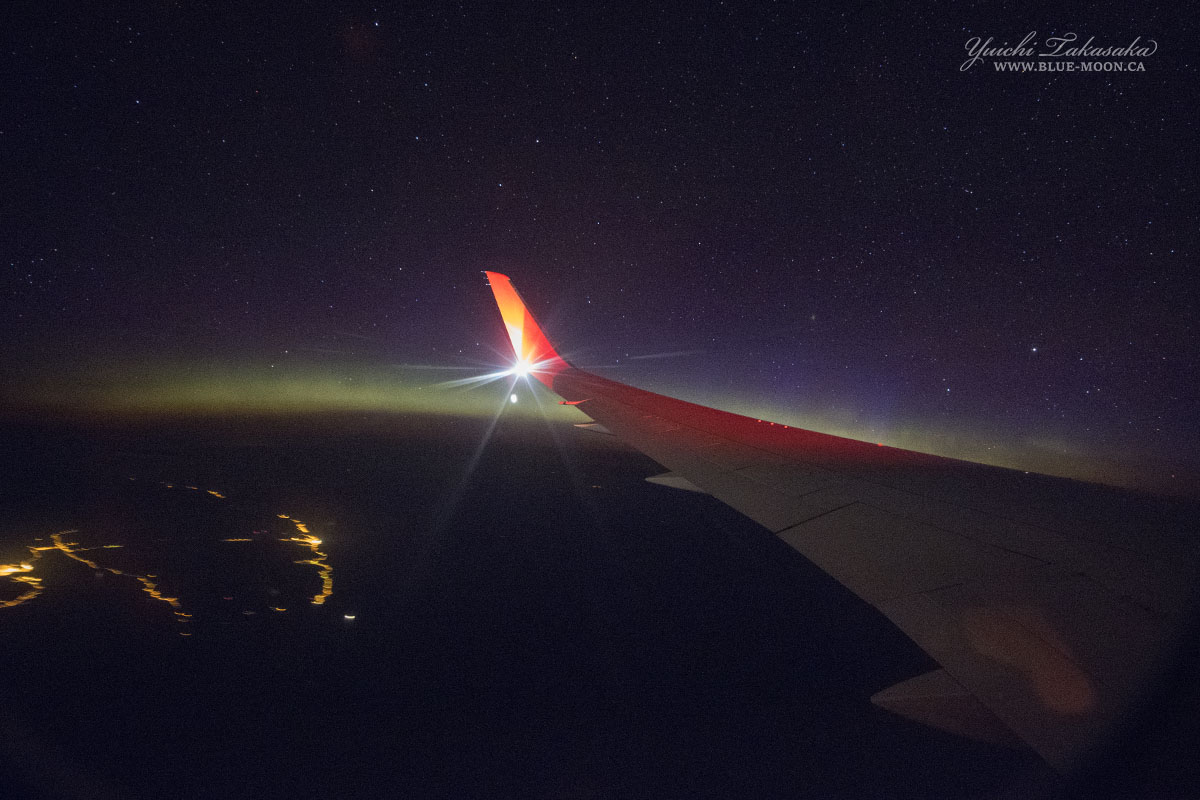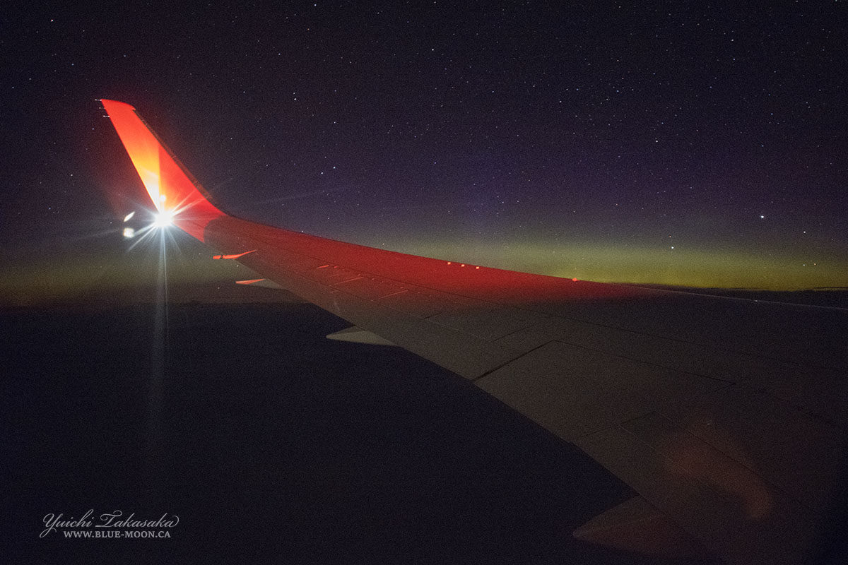 カナダからイギリスへ向かう機内で、カナダ東部時間17日23時(世界時18日3時)過ぎに撮影されたオーロラ。