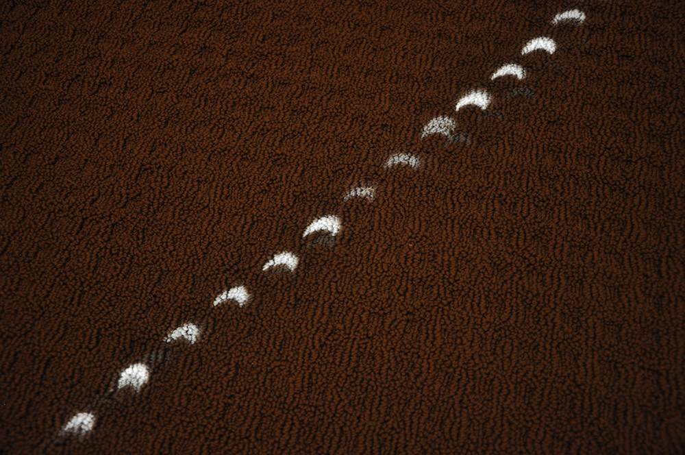 現地8月21日11時35分(世界時17時35分)に、アイダホ州で撮影した皆既日食と、床に並んだ欠けた太陽。
