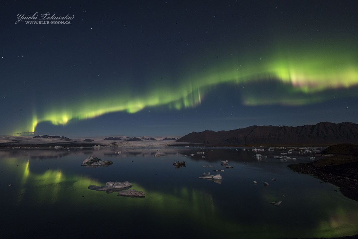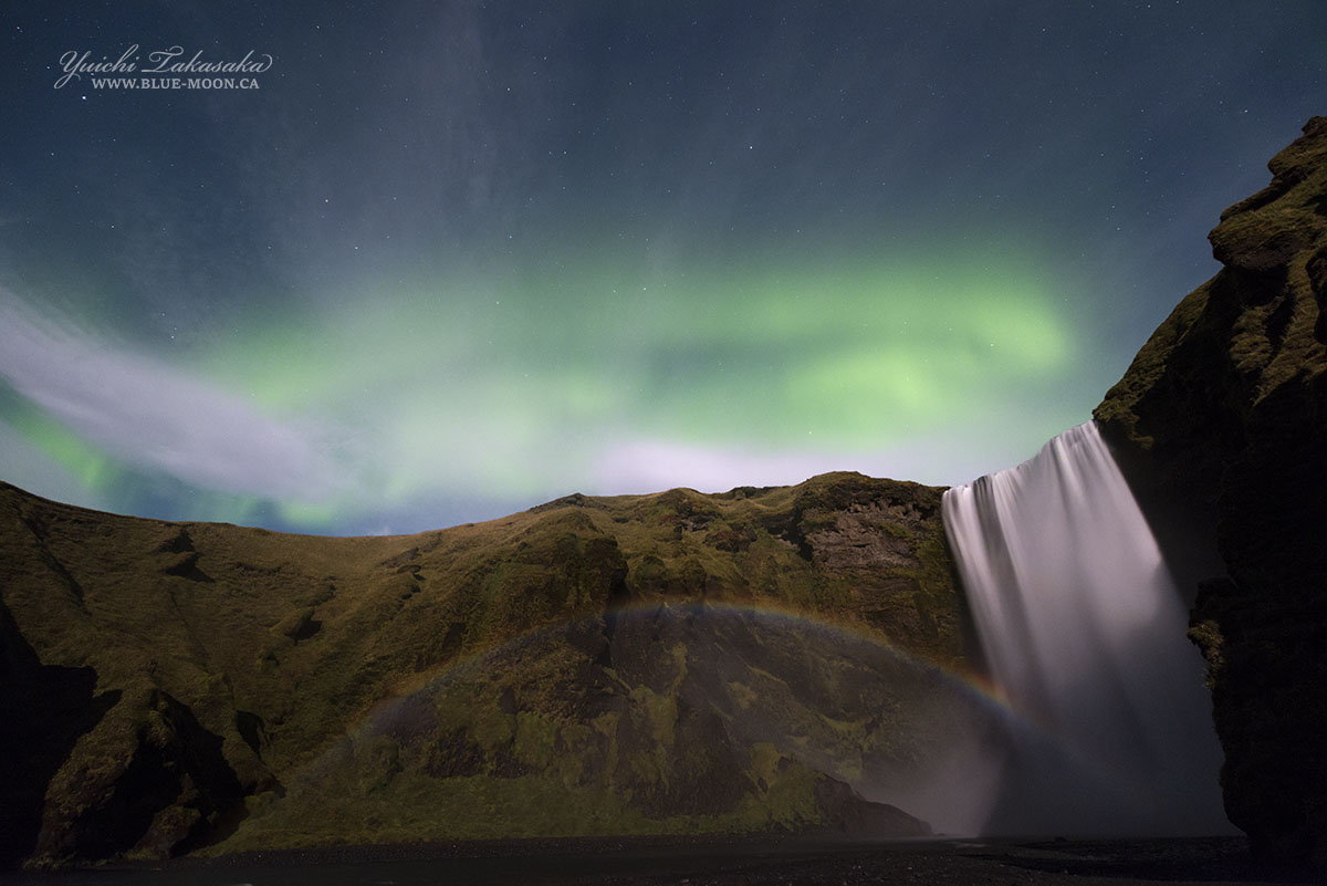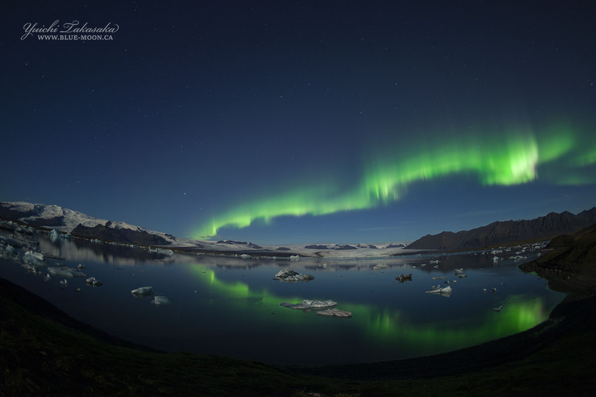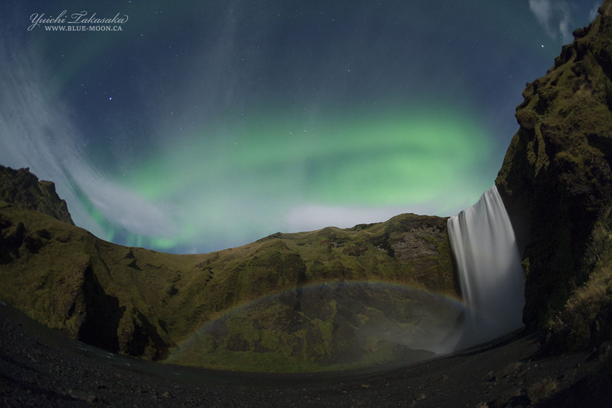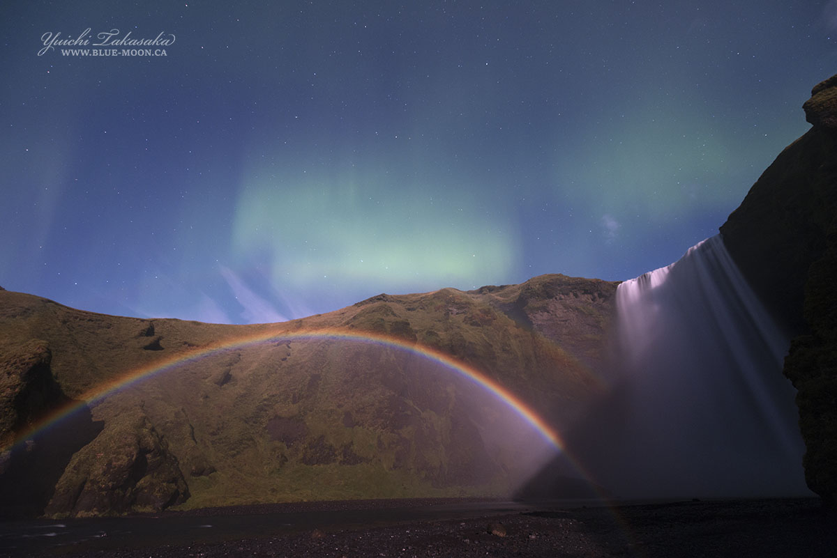 アイスランド南東部のヨークルスアゥルロゥンで撮影されたオーロラと南部のスコゥガルで撮影された月虹。
