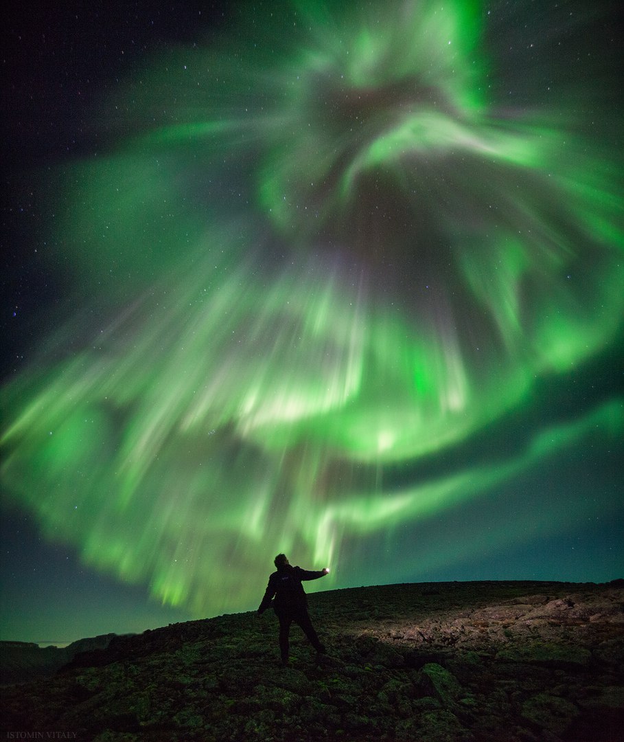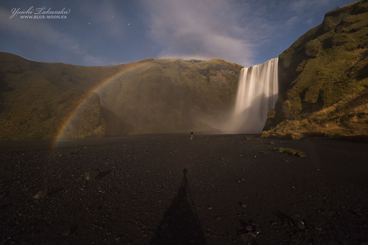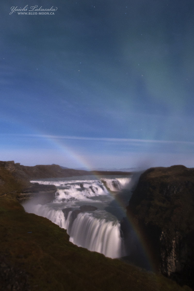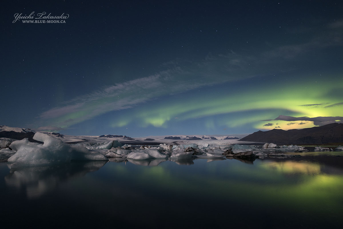 アイスランド南東部のヨークルスアゥルロゥンで撮影されたオーロラと南部のスコゥガルで撮影された月虹。