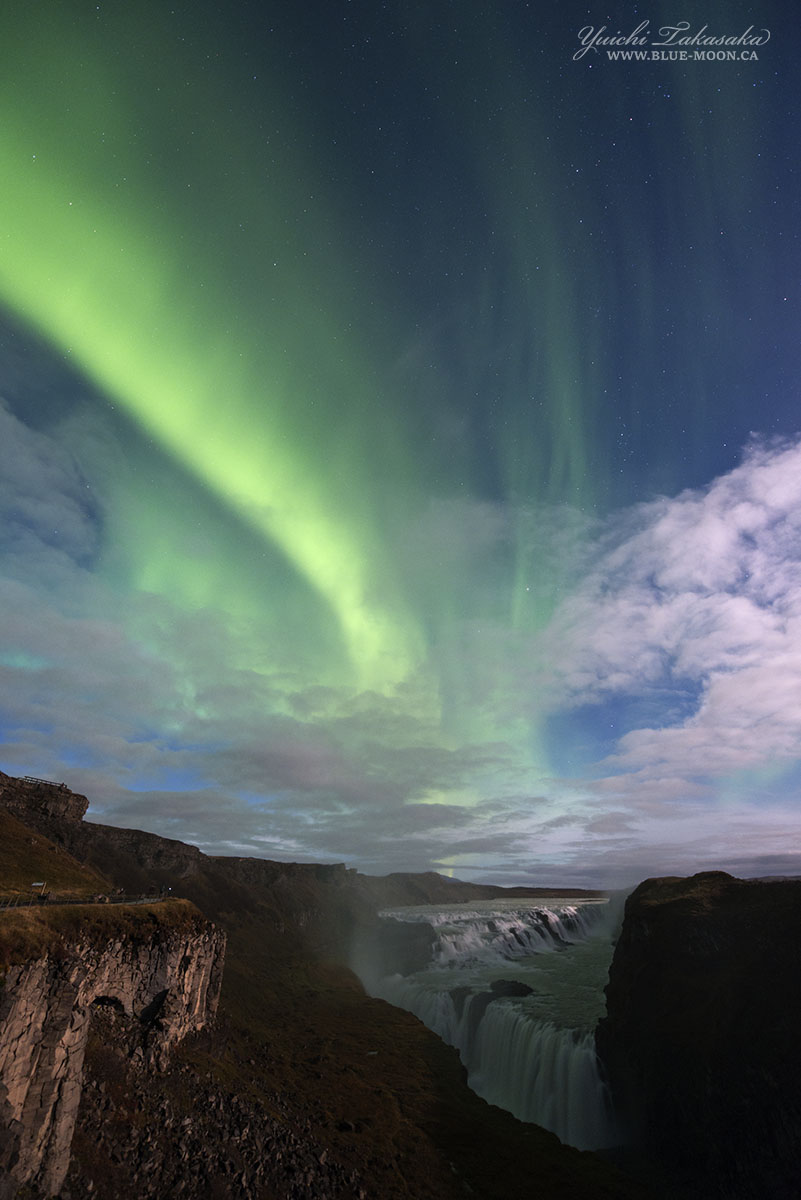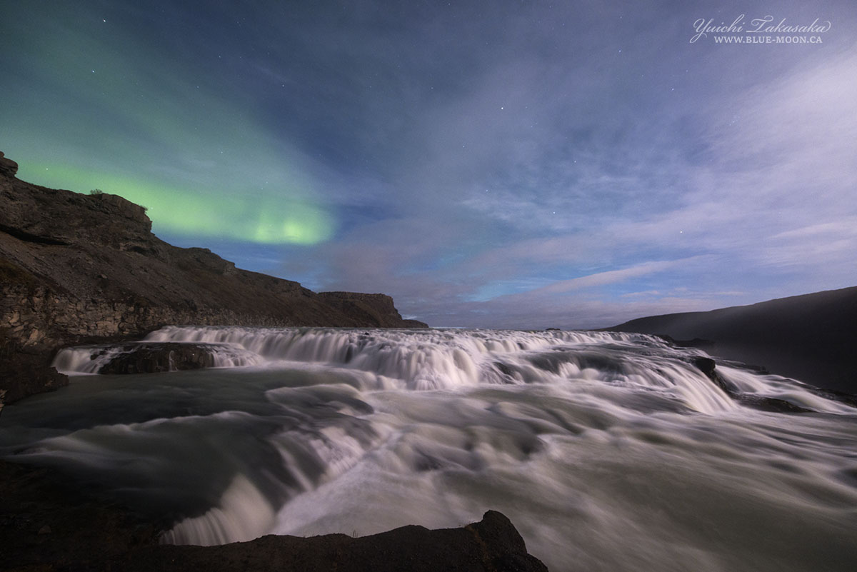 アイスランド西側のグトルフォス(Gullfoss)で、10月5日夜に撮影されたオーロラ。