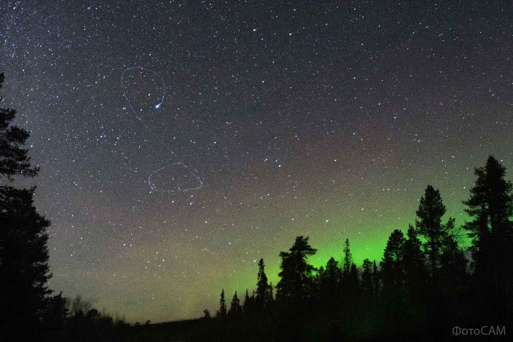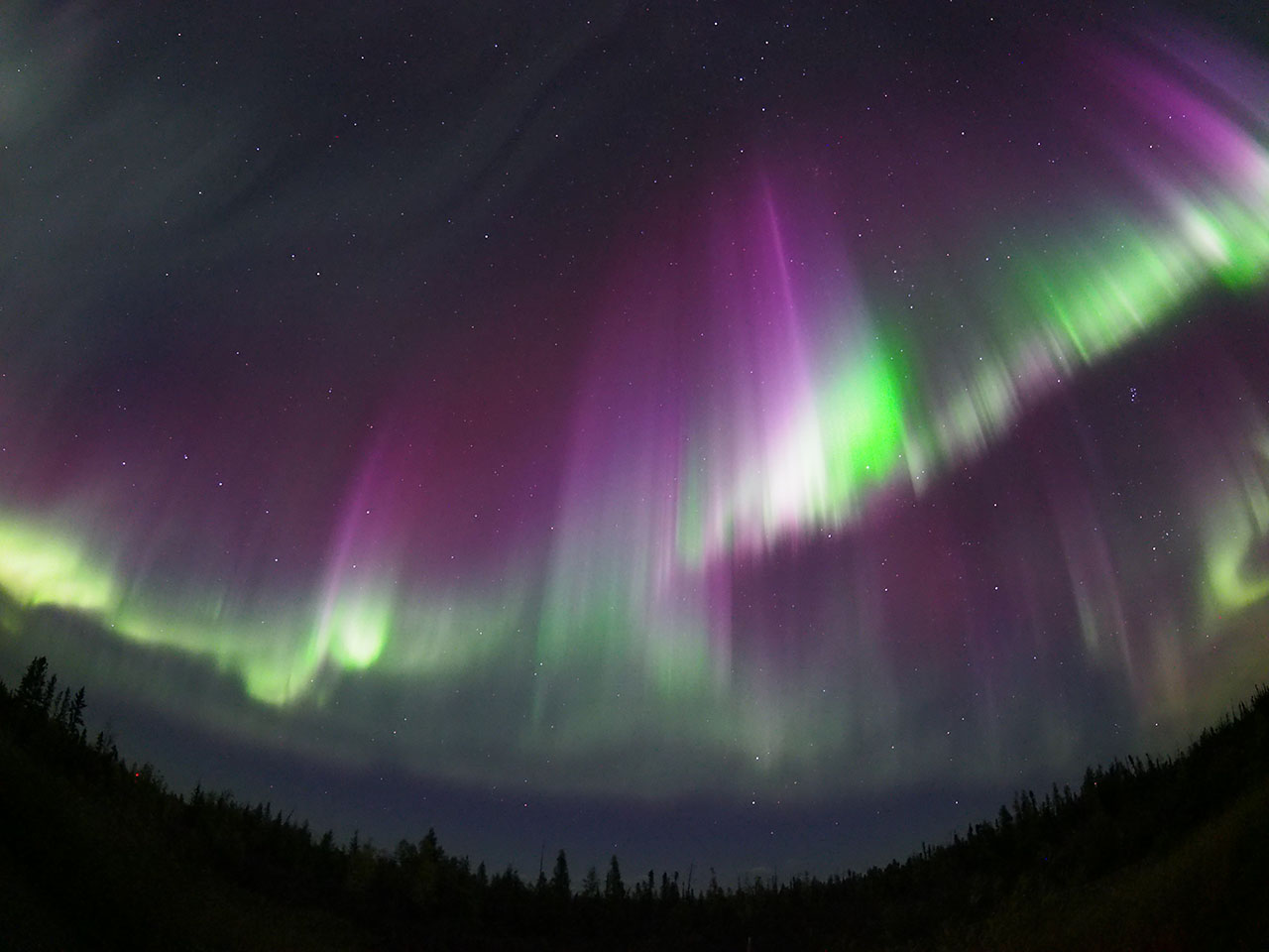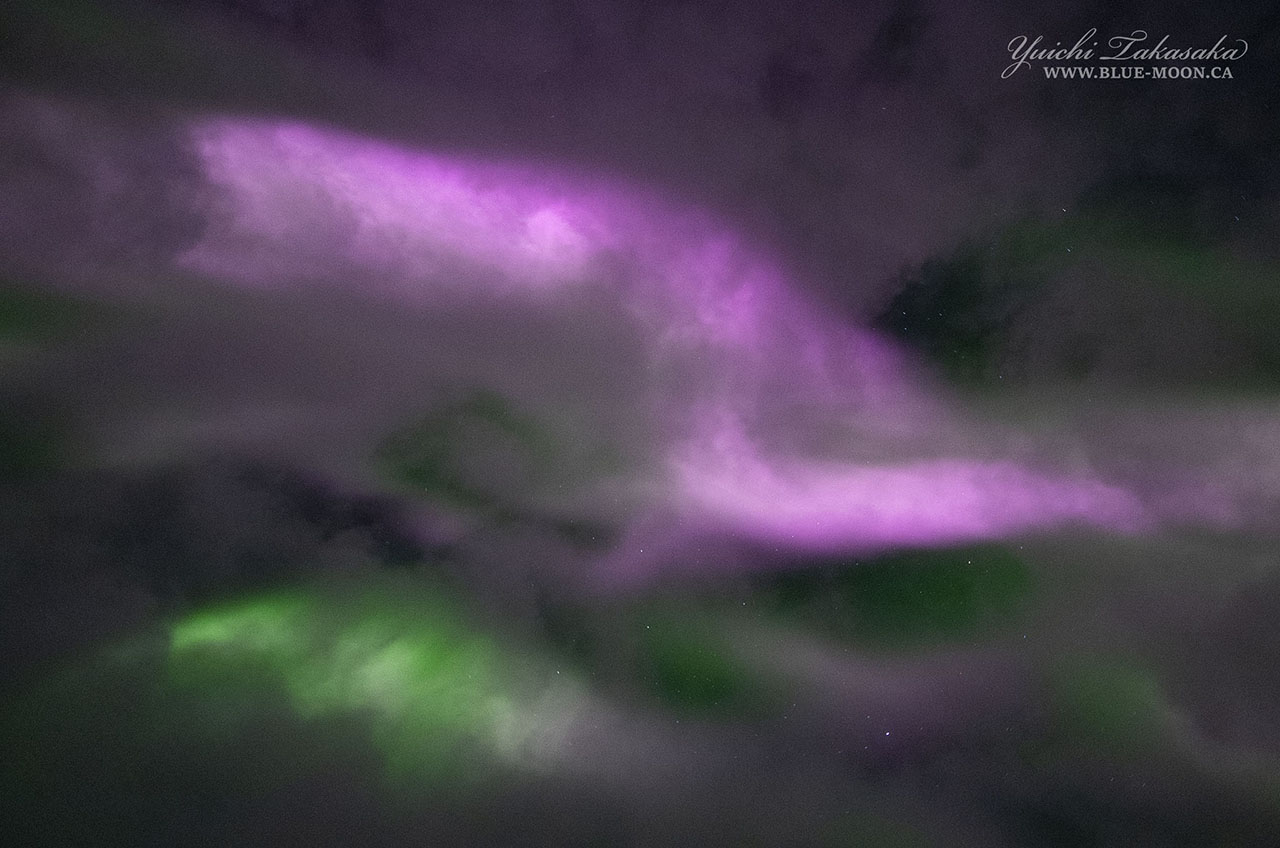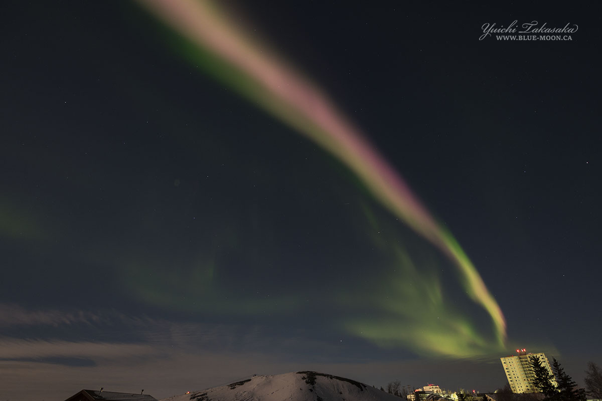 イエローナイフで、現地3日23時43〜44分(世界時4日5時43〜44分)に撮影されたオーロラ。
