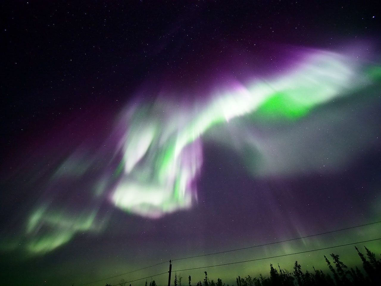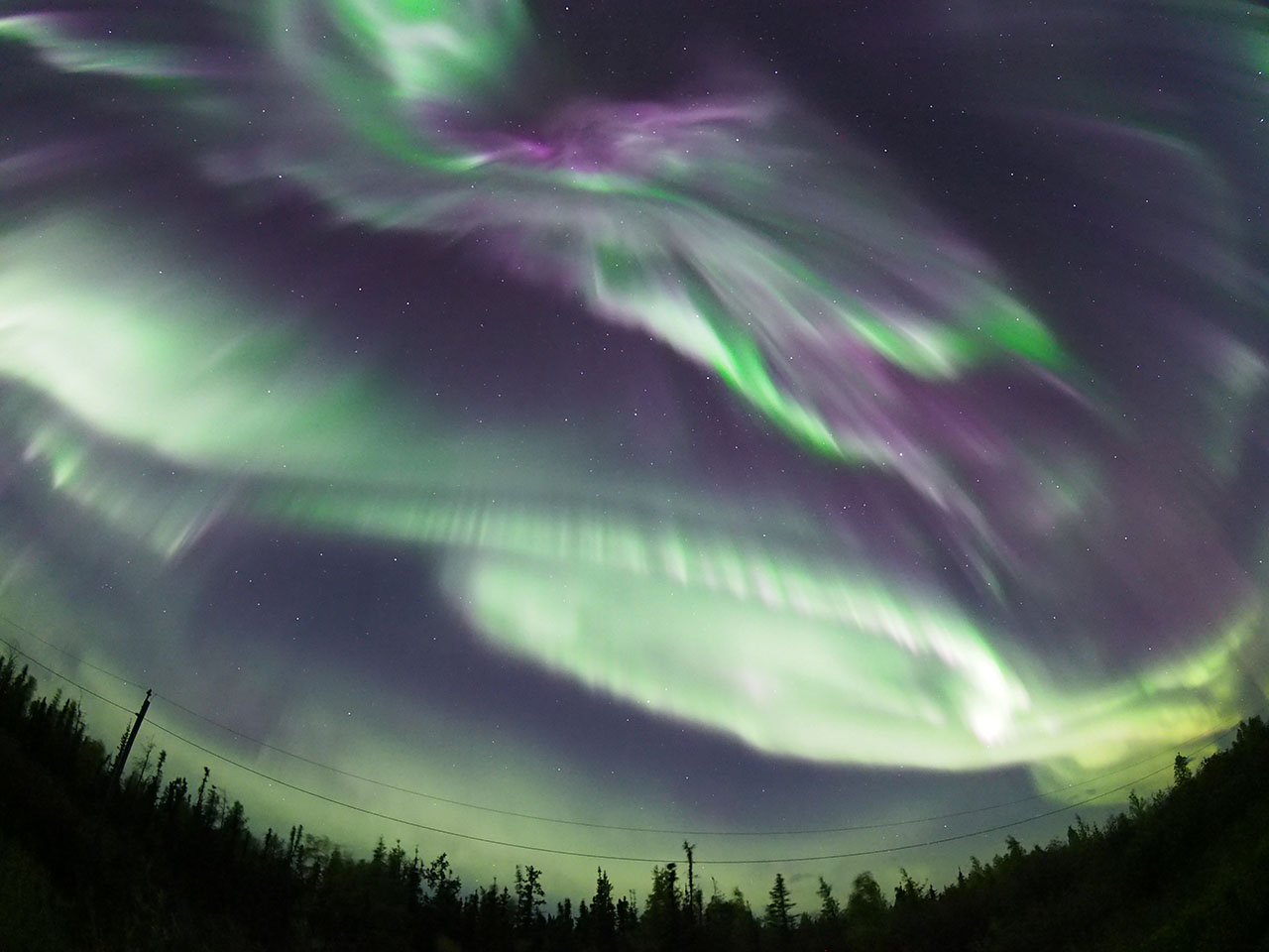 イエローナイフで、現地11日2時(世界時11日8時)に撮影されたオーロラ。