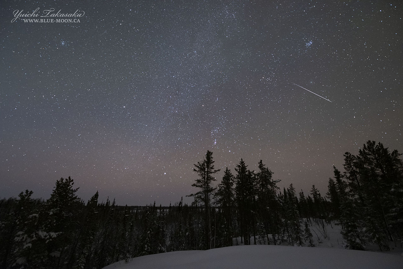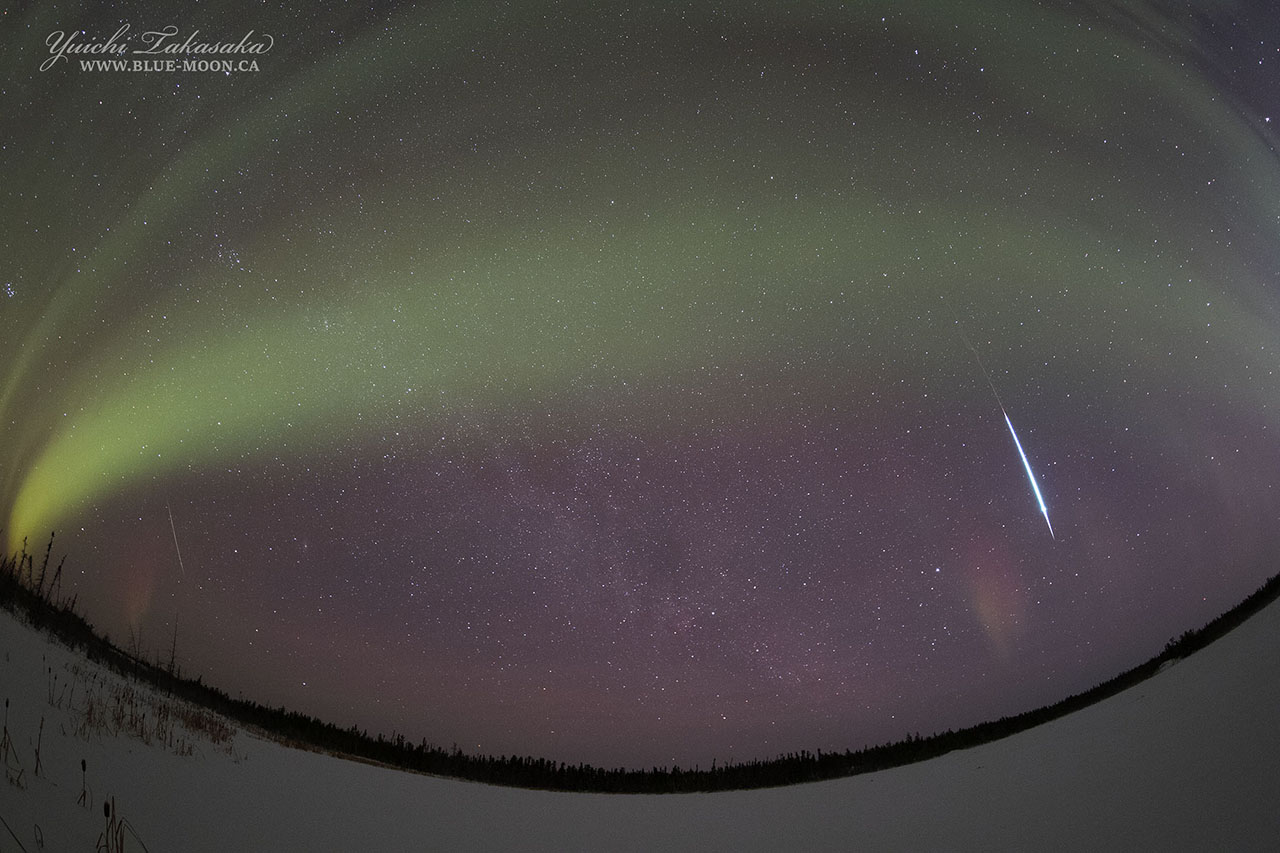 イエローナイフで撮影されたふたご座流星群の流星とウィルタネン彗星。現地16日1時半(世界時16日8時半)のオーロラ。