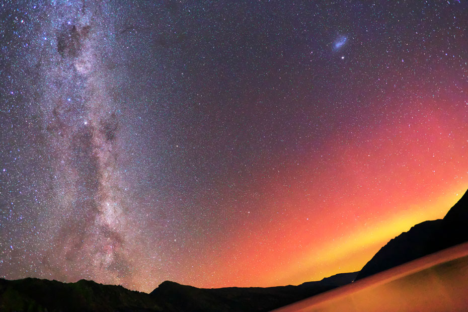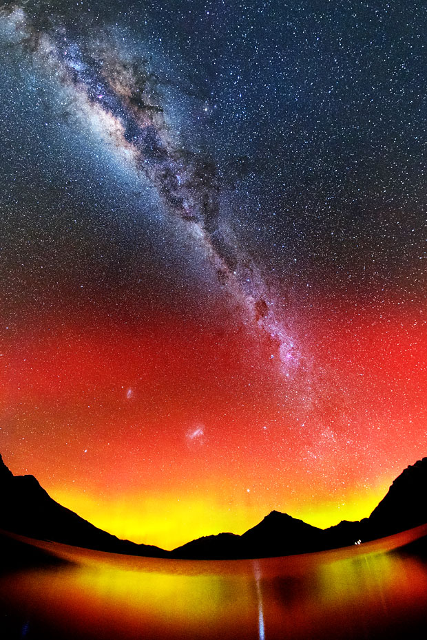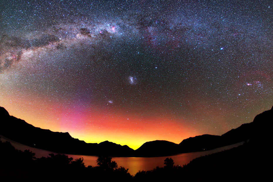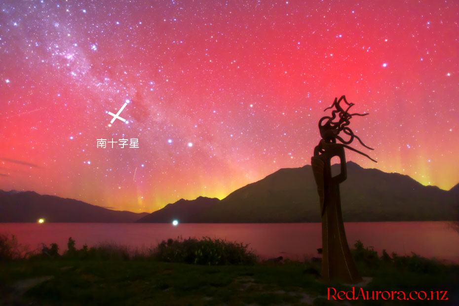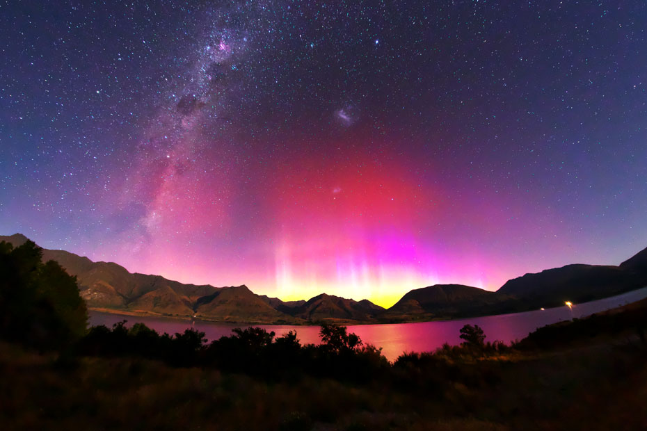 ニュージーランド南島クィーンズタウンで、現地13日1時28分(世界時12日13時28分)に撮影されたオーロラ。