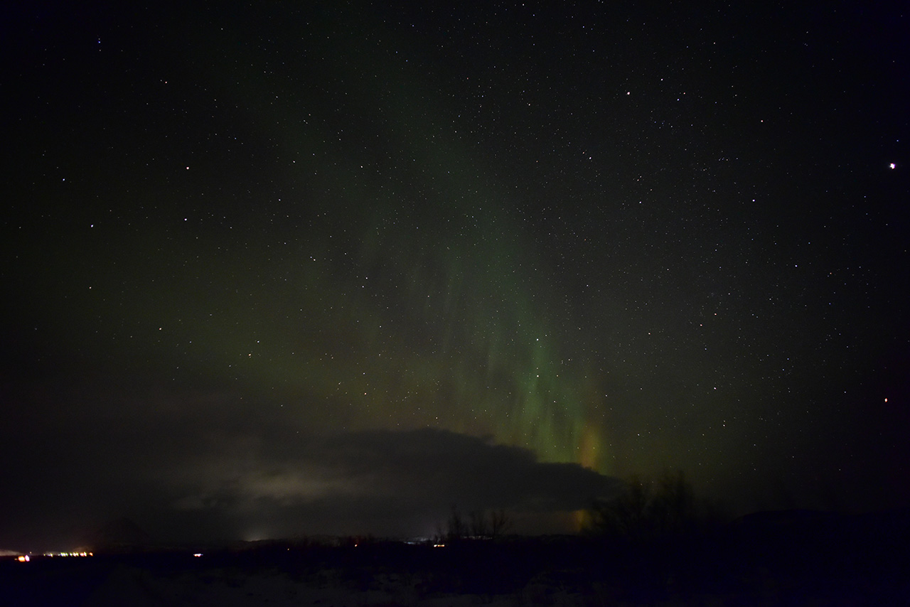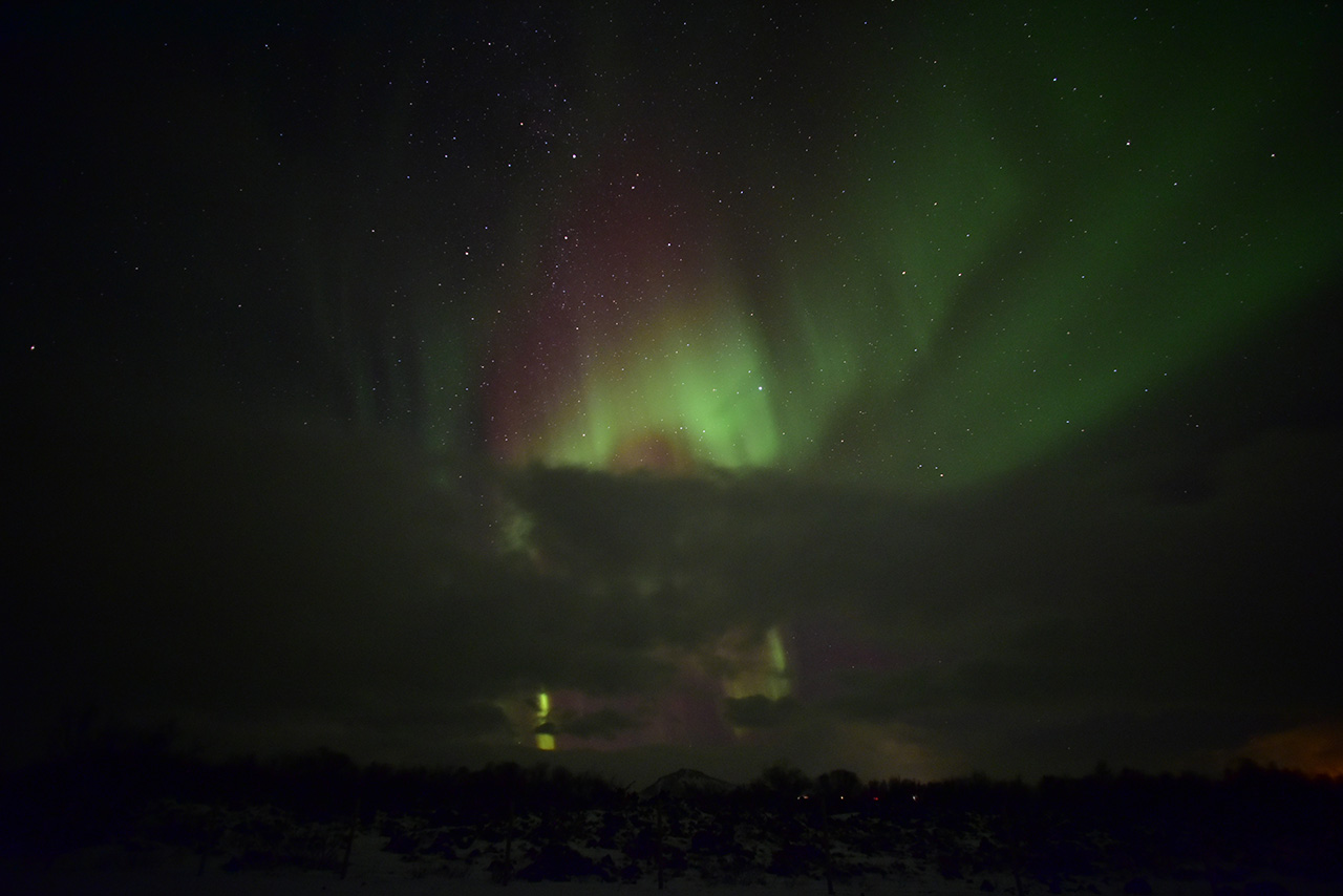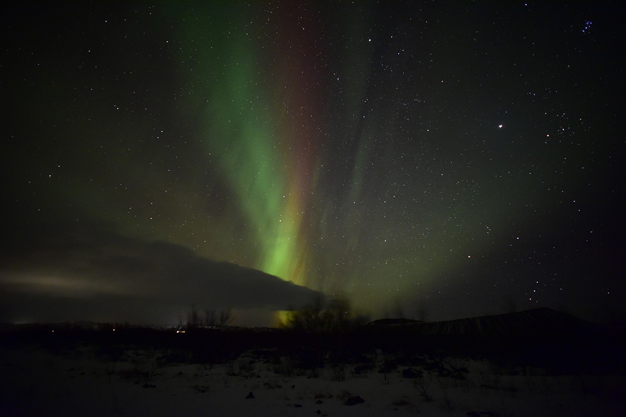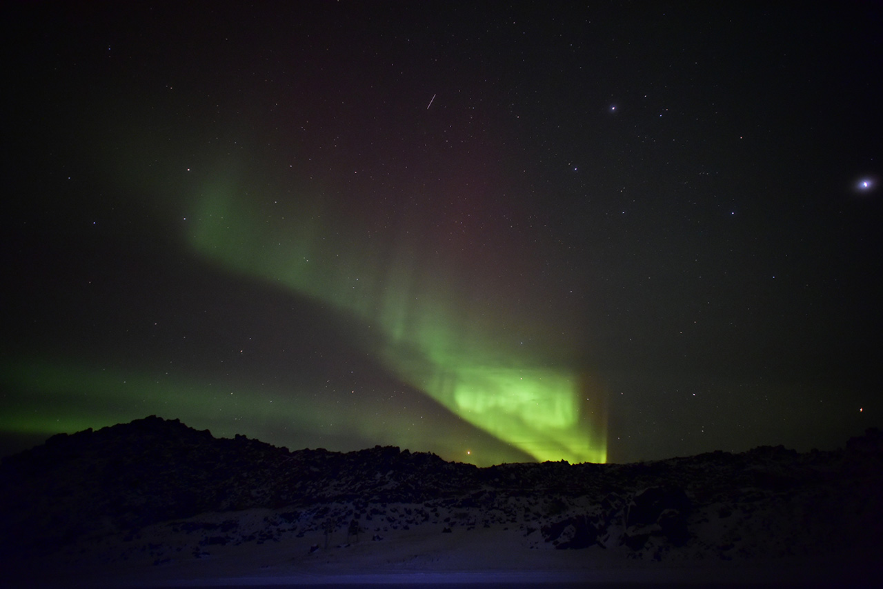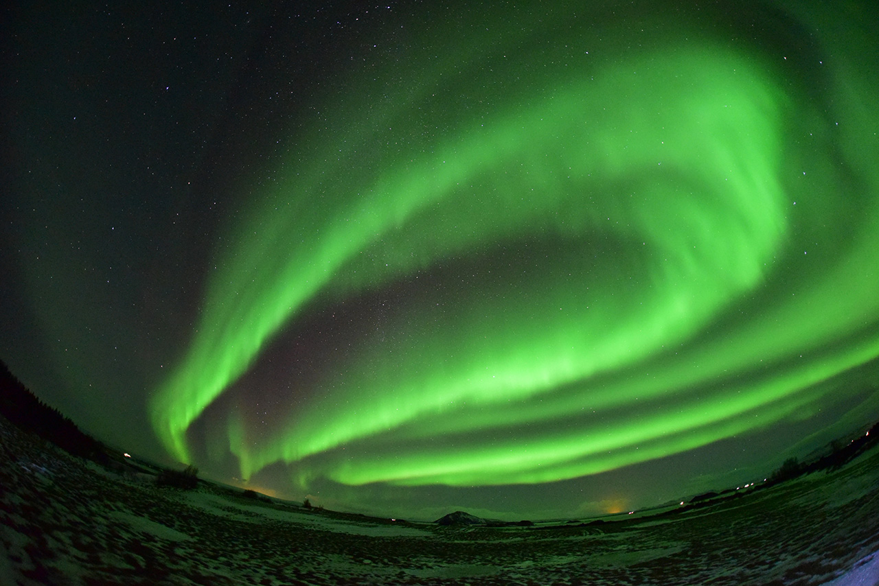 アイスランド北東部のミーヴァトン湖畔で、現地12月23日20時半(世界時と同じ)に撮影されたオーロラ。