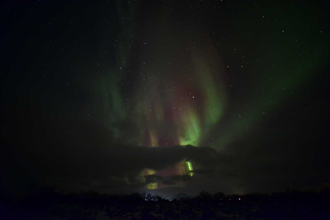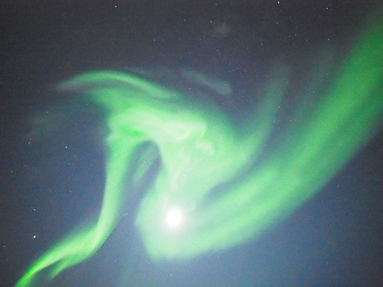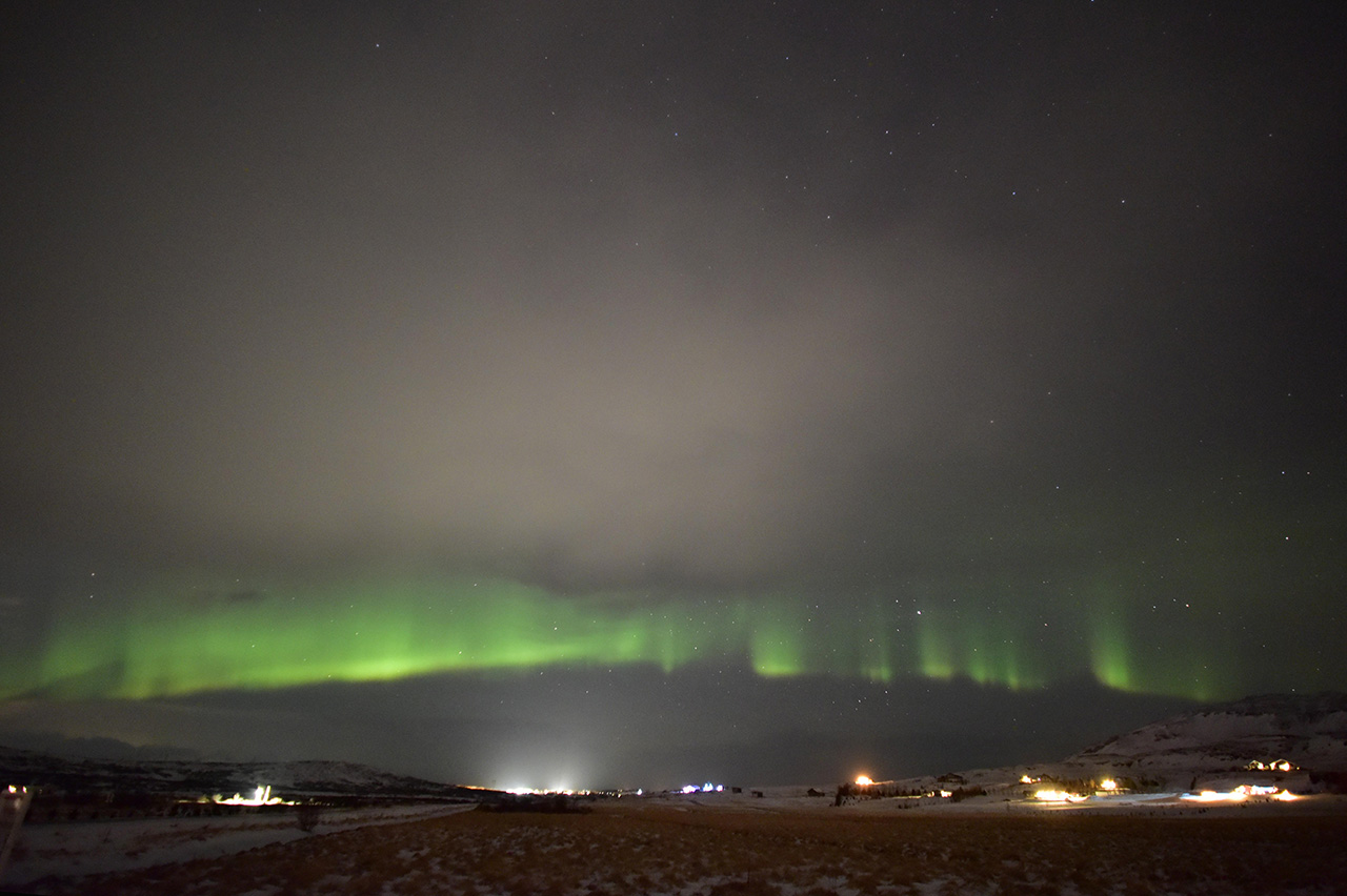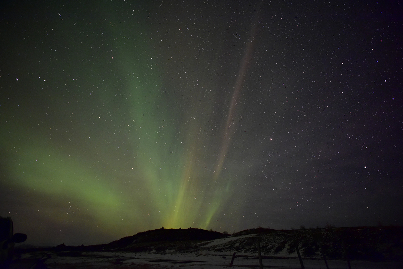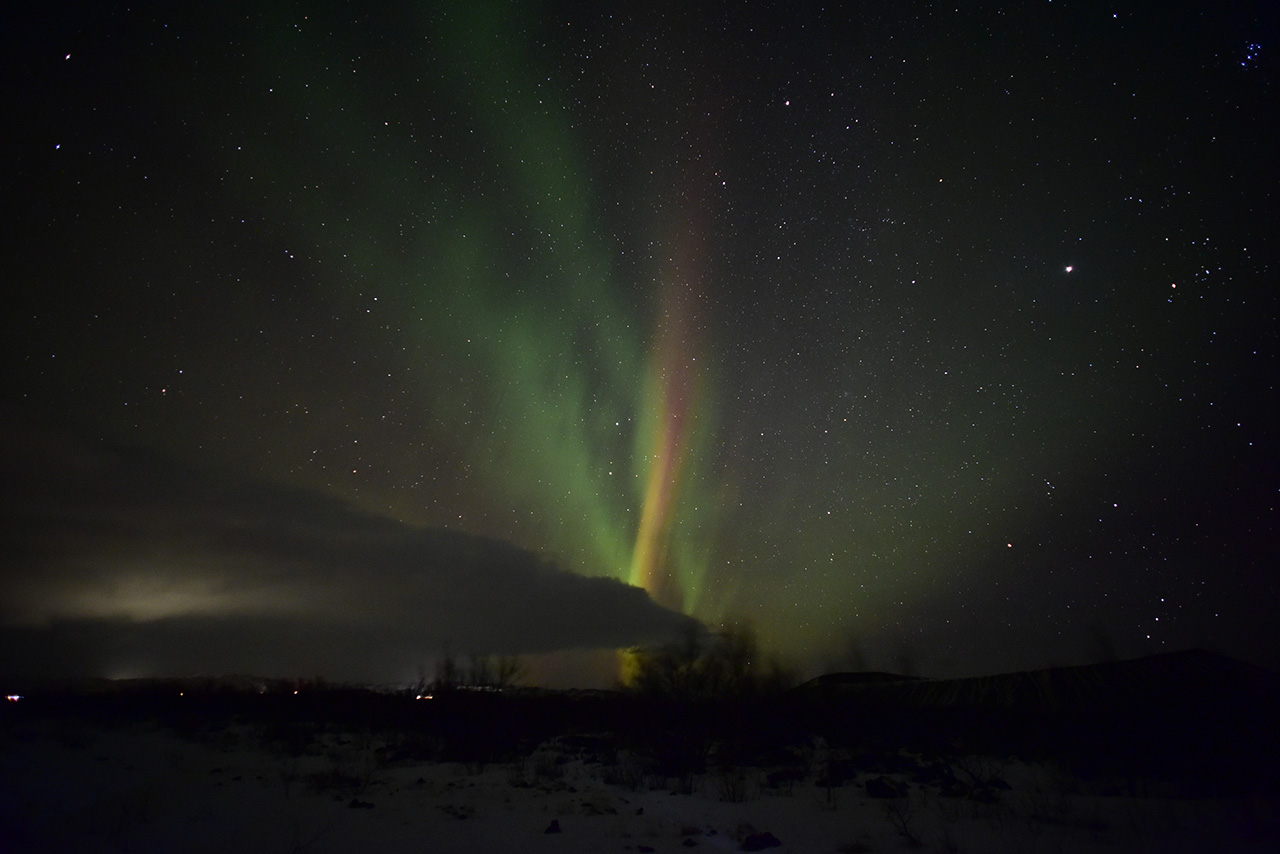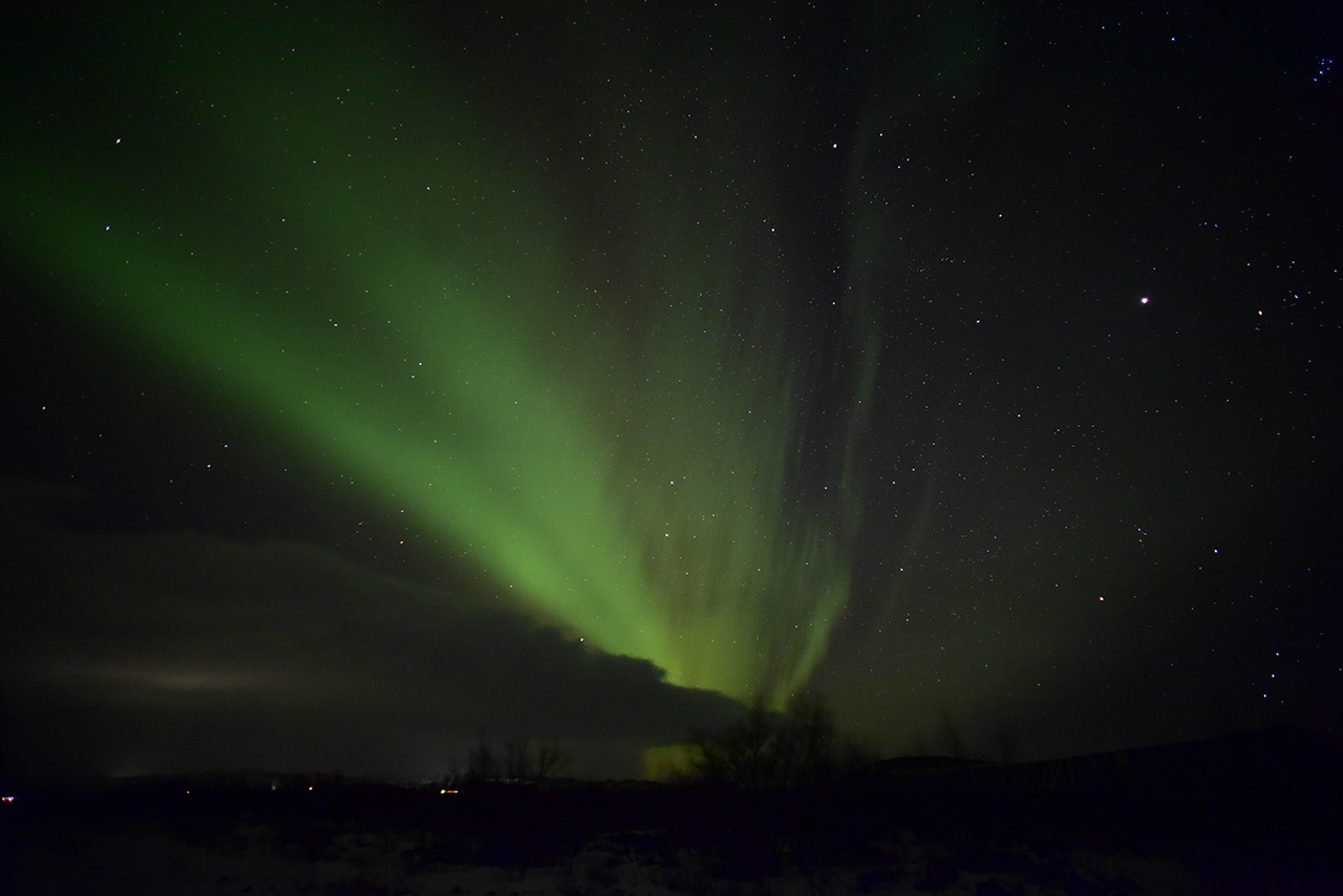 アイスランド北東部のミーヴァトン湖畔で、現地12月23日20時半(世界時と同じ)に撮影されたオーロラ。